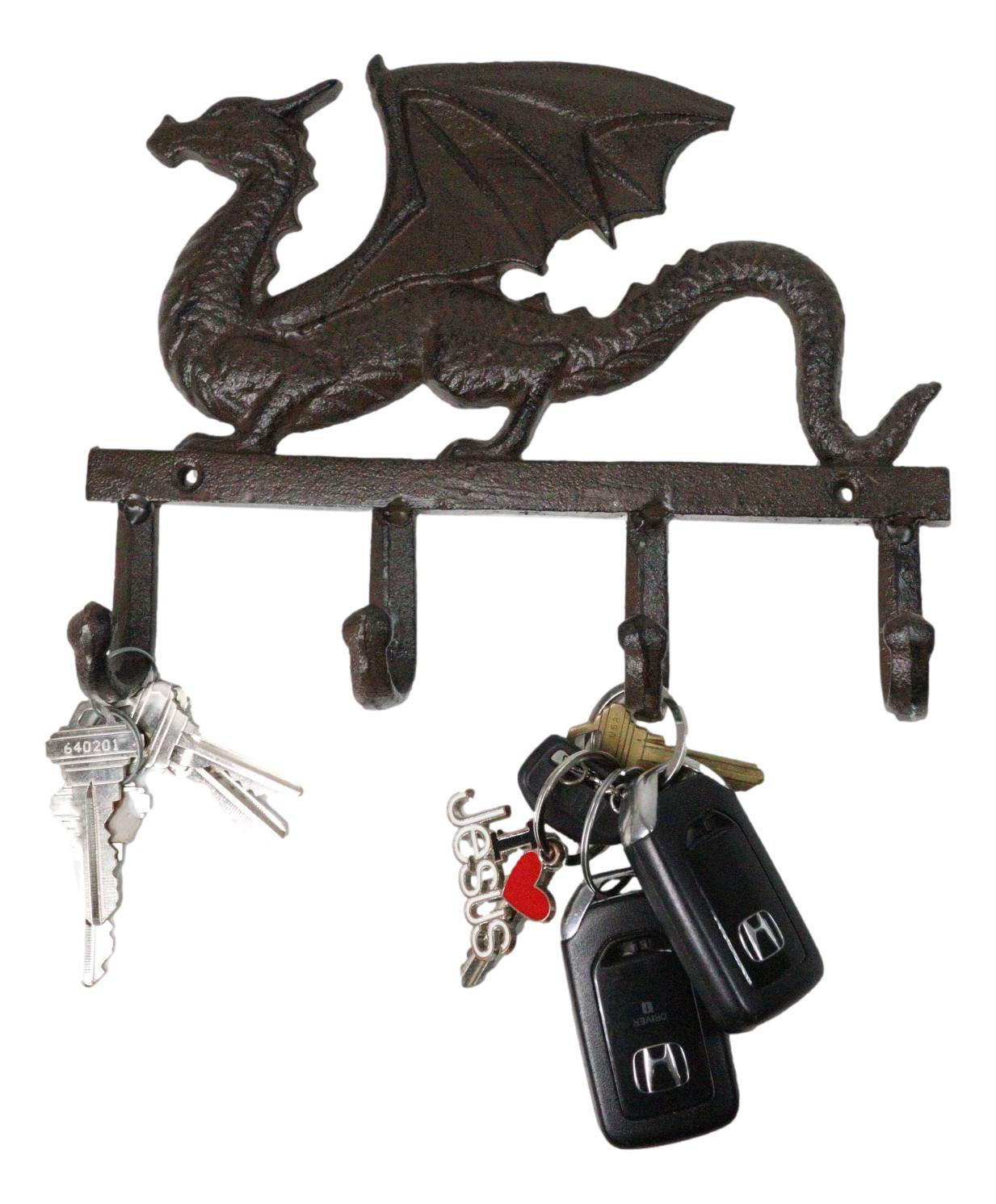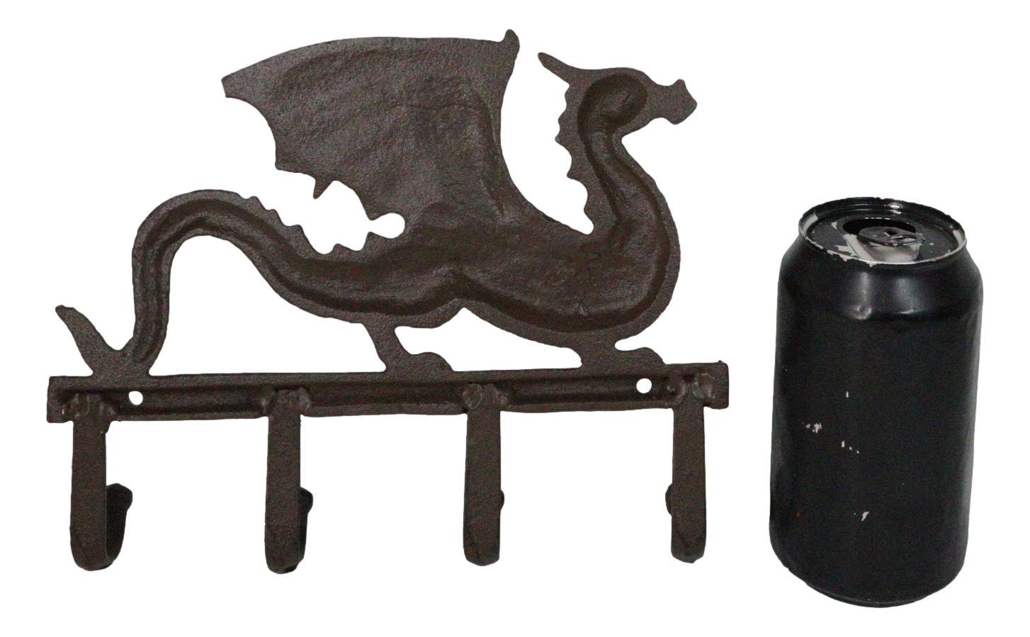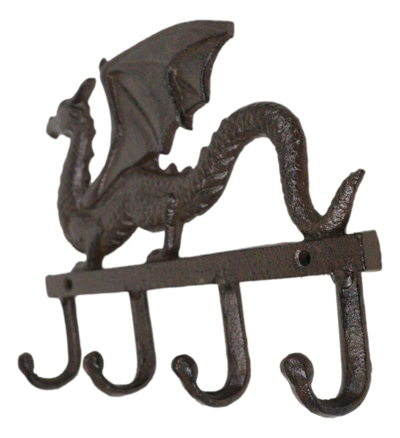 ? Add mythical strength and style to your space with this Cast Iron Legends Fantasy Guardian Dragon Wall Hook Sculpture. Featuring a fierce sentinel dragon design, this detailed piece offers four sturdy pegs for hanging coats, hats, keys, or accessories. Its rustic cast iron finish brings an old-world, legendary charm, making it a striking and functional accent for fantasy lovers, medieval decor, or themed interiors.