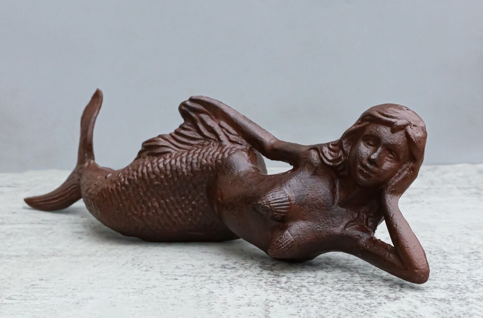 ? This Beautiful Nautical Ocean Mermaid Sculpture is made of solid cast iron, hand painted and polished individually with aged vintage bronze finish. Color tone may vary slightly from pictures.