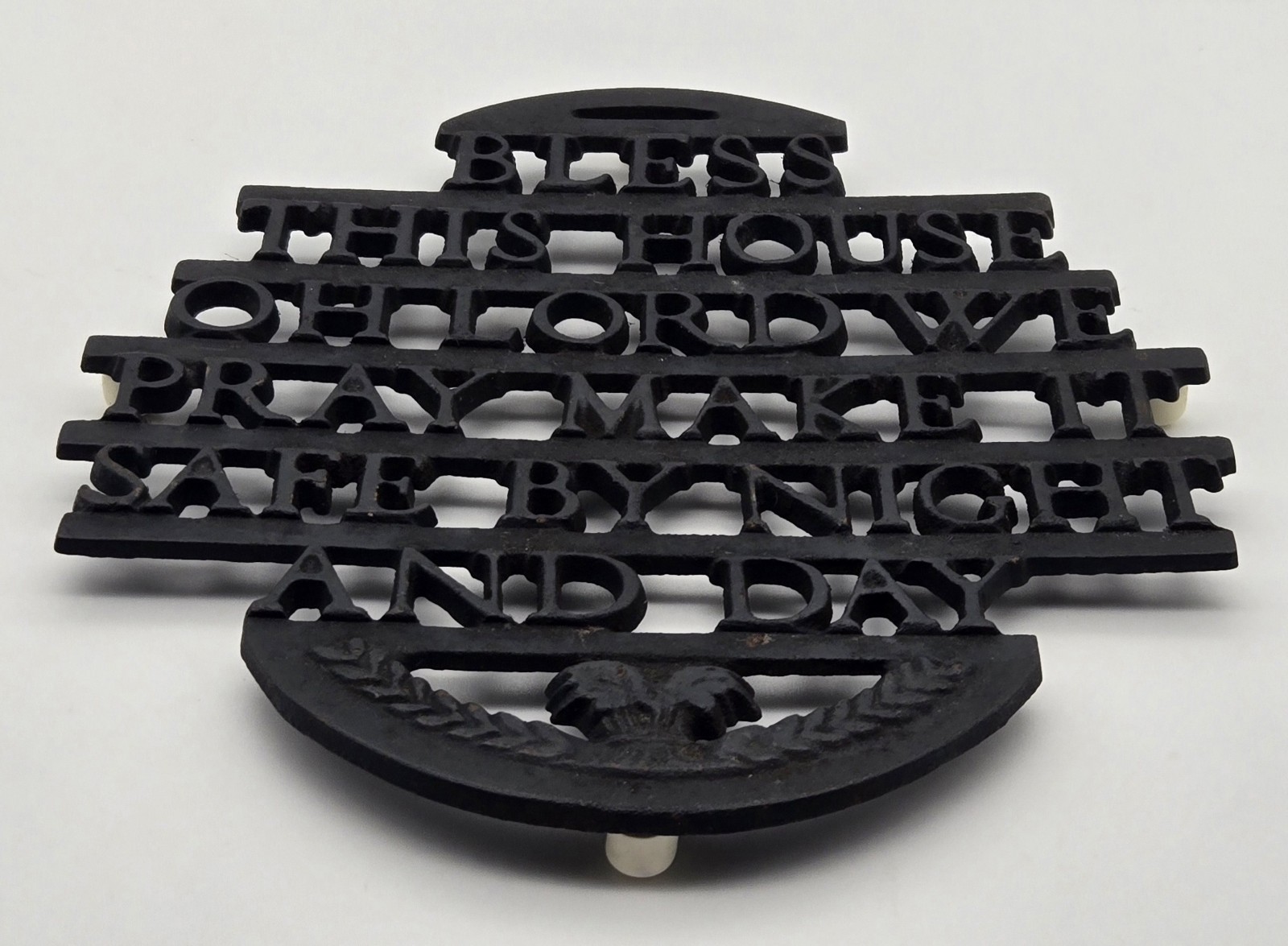 Cast Iron Trivet ?Bless This House? Prayer Vintage Kitchen Wall Decor Description: Cast Iron Trivet ?Bless This House? Prayer Vintage Kitchen Wall Decor Bring faith and function into your home with this vintage cast iron trivet engraved: ?Bless This House Oh Lord We Pray Make It Safe By Night And Day??both a decorative and useful accent. Condition: Preloved - May show signs of usage consistent with vintage age. Closely review photos for overall detailed condition. Measurements in Inches: 7x6.5x.25 Highlights: ? Vintage cast iron trivet with prayer inscription ? Reads ?Bless This House Oh Lord We Pray ? Make It Safe By Night And Day? ? Can be used flat as a hot pad or hung as wall decor ? Solid heavy-duty metal construction, classic rustic charm ? Collectible piece ideal for farmhouse, religious, or vintage kitchens See our other unique items at Sellz-It. We believe in reducing reusing and recycling.