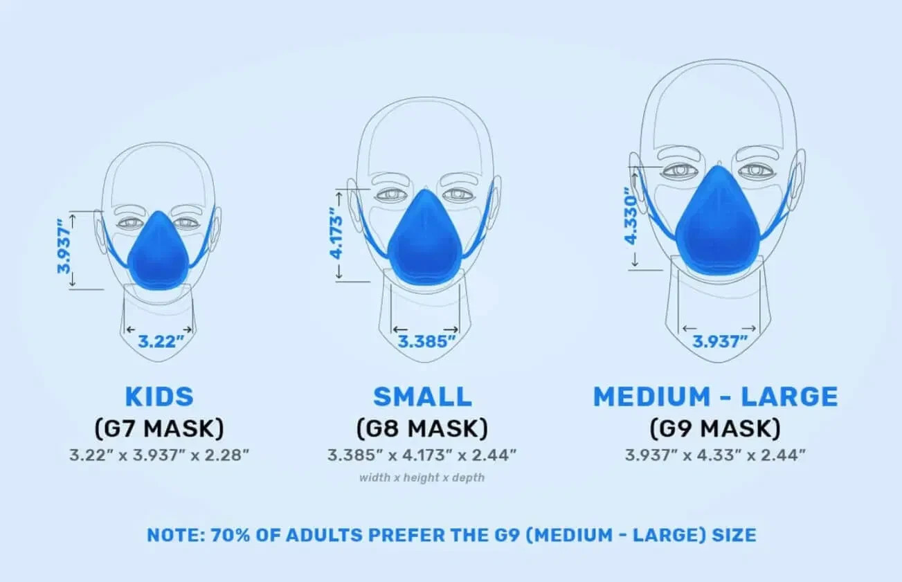 CUSTOM FIT: The G-Series Mask comes in two sizes to fit everyone! Small (G8), and Medium - Large (G9). The Small mask measures 3.385 x 4.173 Inches, and the Medium - Large Mask is 3.937 x 4.330 Inches. 70% of adults prefer the Medium - Large (G9) Mask, find the fit that is right for you. Comes in a multicolored rainbow and solid blue.