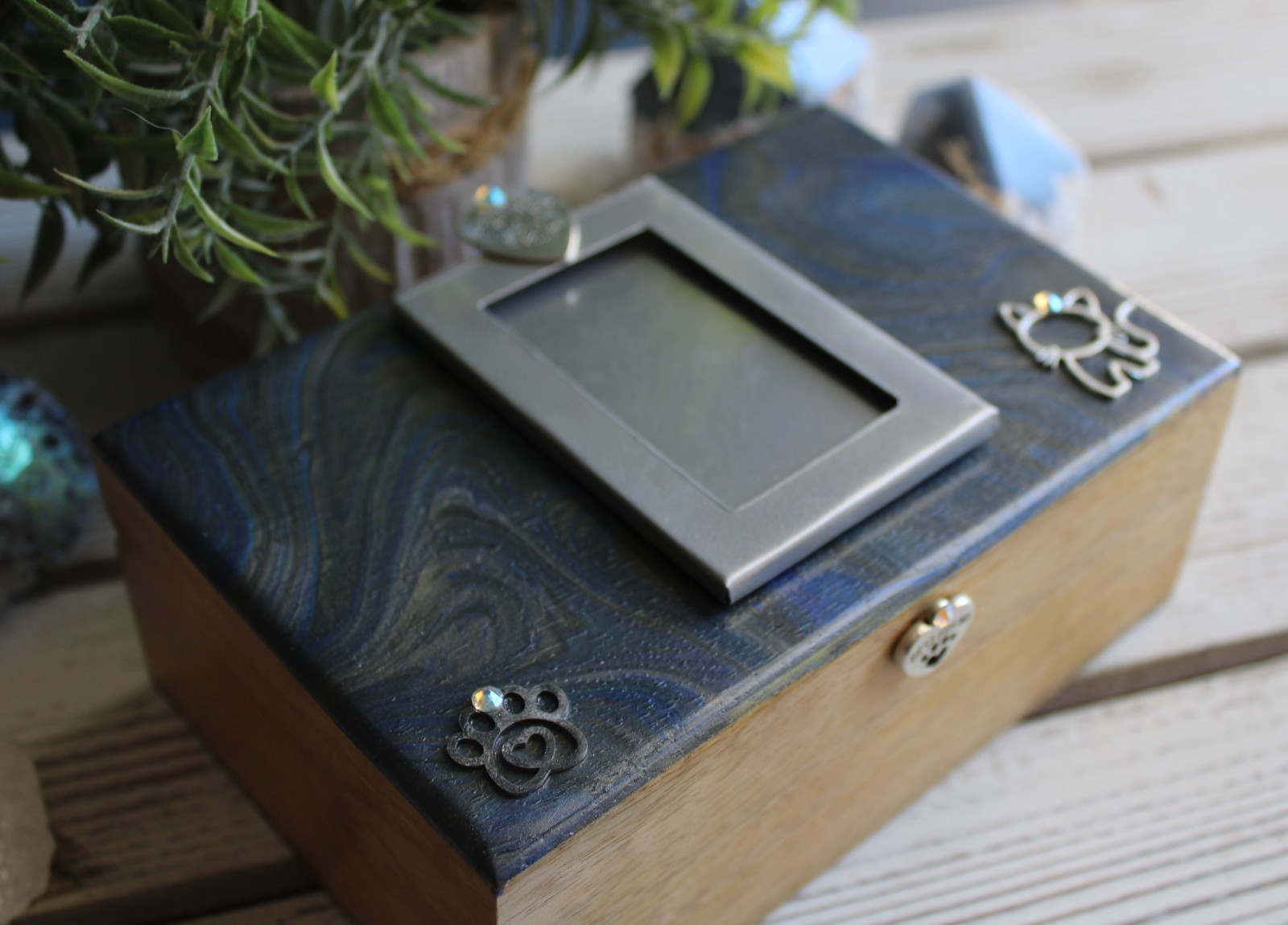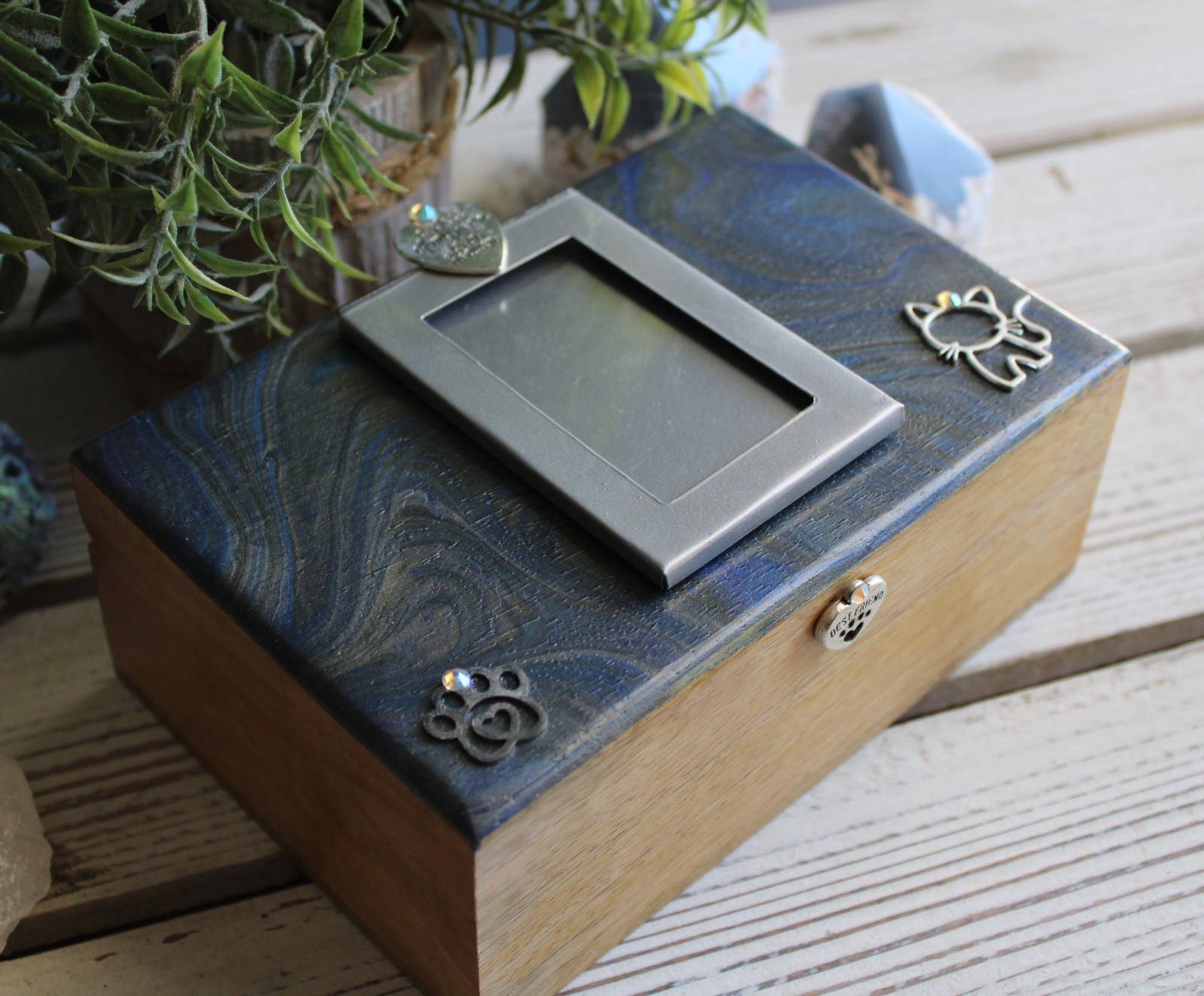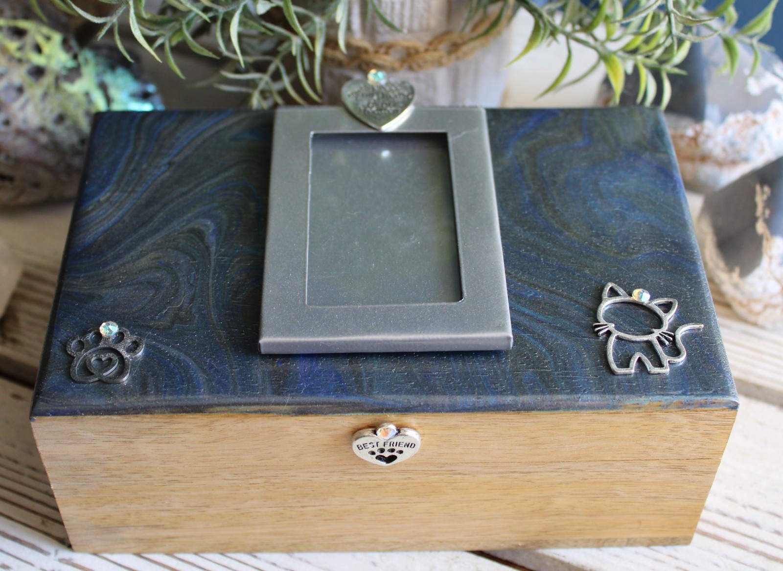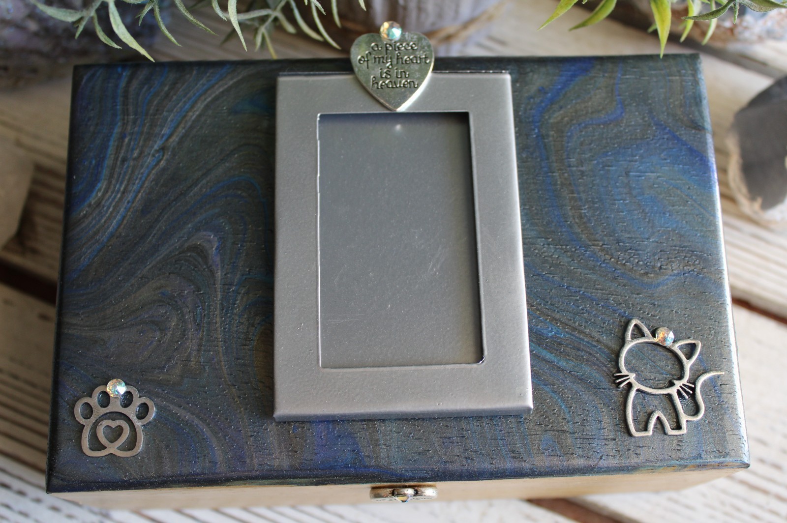 This is a Memorial Urn with a Photo Frame to include of your beloved Kitty. It measures 6" x 4" x 2.5". I created it using the acrylic pour method, so no two will ever be alike. This Urn box will accommodate the remains for a pet up to 30 pounds.