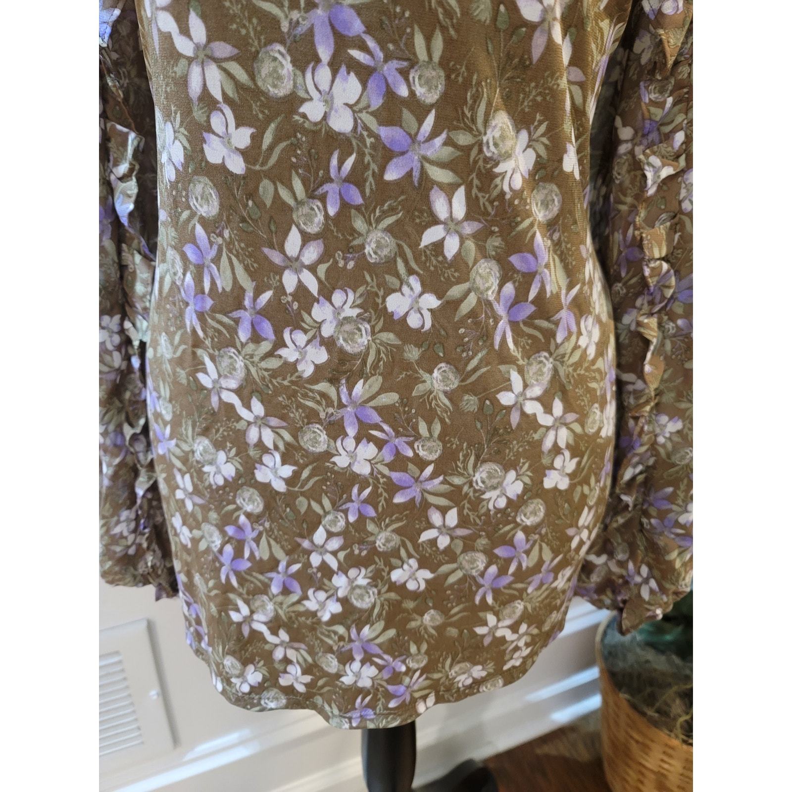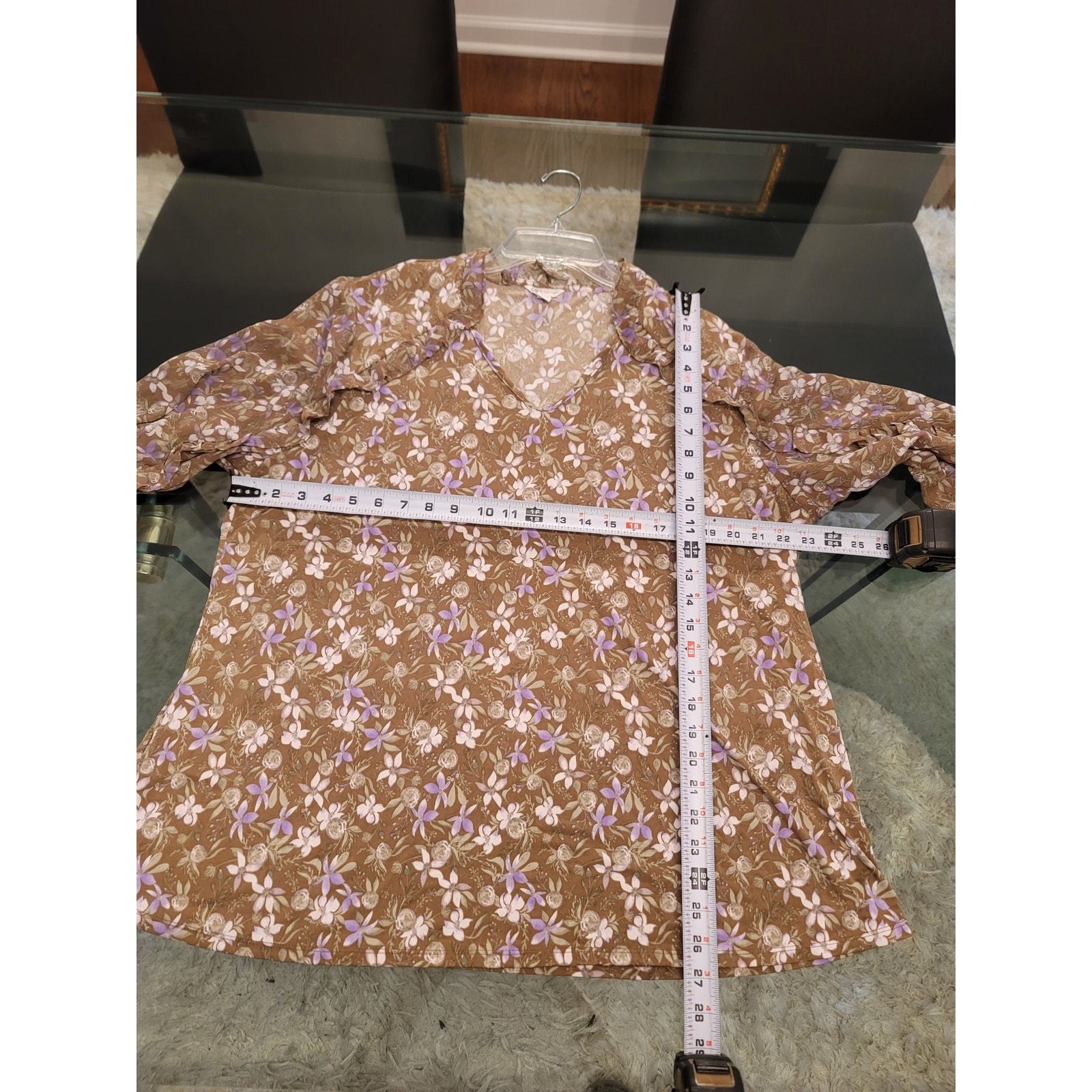 Featuring a lovely brown and purple floral pattern, this long-sleeve, v-neck top is perfect for adding a touch of elegance to any outfit this blouse is in great condition and ready for a new home. It's a plus size, making it a comfortable and flattering fit for many body types.