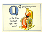 Cavallini Letter Q Framable Nursery Art Junk Journal The letter Q illustration features a regal queen on her thrown with the words "q begins queen with the crown on her head" Vintage 1930s Illustration Repro Alphabet Cavallini Co San Francisco Vintage 2002 Heavy Card Stock Flash Card No longer available at Cavallini. Approximate size 6.5" Wide x 4.75" H Condition is new. Ships promptly. Thank You! 202301 A20g17 4o