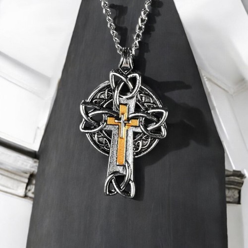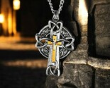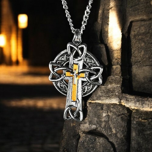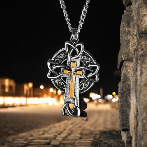 "This striking Celtic Cross pendant blends tradition and elegance with intricate knotwork and a gold-tone cross centerpiece. A symbol of faith, heritage, and unity, this necklace is perfect for those who appreciate spiritual and cultural significance in their jewelry. Crafted with care, it's a timeless accessory for everyday wear or a meaningful gift for special occasions."