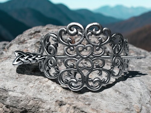 This beautiful Celtic knot hair clip features intricate heart and swirl patterns, crafted from metal. Ideal for adding a touch of elegance and tradition to any hairstyle, this accessory is perfect for Celtic and bohemian fashion lovers.