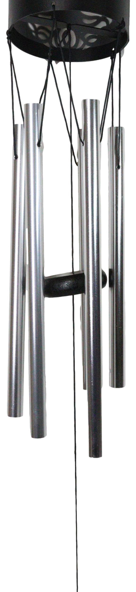 ? This Artistic Filigree Metal Solar Wind Chime is made of steel metal, powder coated in black.
