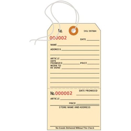 CENTURION repair tag features a one part, perforated design ideal for use in a variety of businesses. Both parts of tag are pre-numbered to match item in store with claim check. Provides ample space for important information and is non-logoed. Product is available in a 1000 Pack and measures 2-1/4" x 5-1/4".