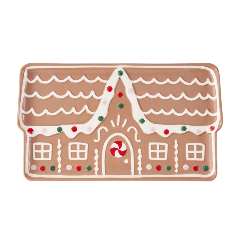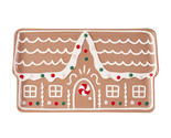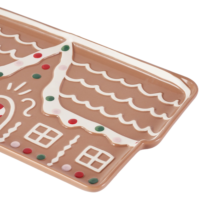 Cheerful, holiday gingerbread houses-shaped serving tray will make guests smile every holiday season Fun, colorful, seasonal serving tray features three sections designed as holiday-themed gingerbread houses for a variety of delectable delights Serve cookies, nuts, candy, or any other yummy snacks with a little extra joy Durable tray constructed of glazed earthenware for years of use Ideal holiday tray for fun, festive affairs during Christmas season Care: Dishwasher and microwave safe; may become hot in microwave Material: 100% earthenware Dimensions: 13.86"W x 7.91"L x 0.94"H