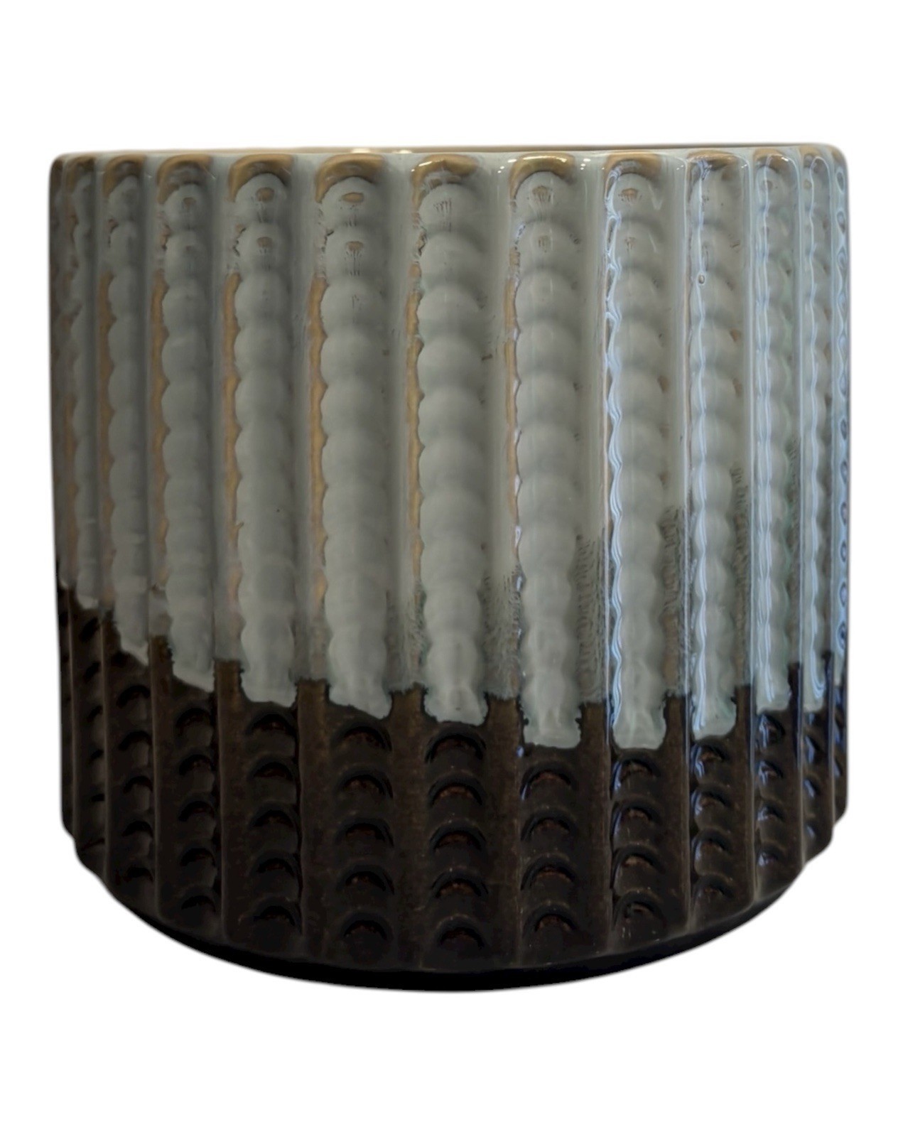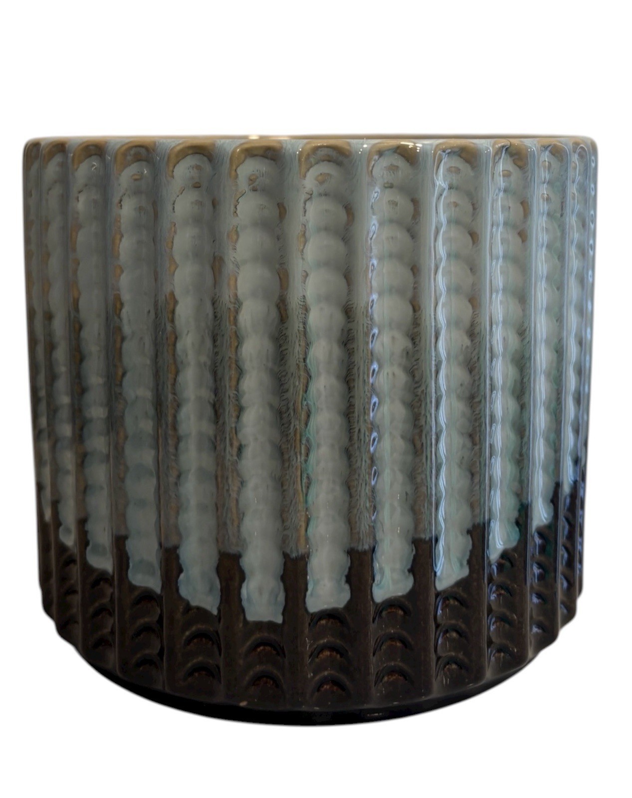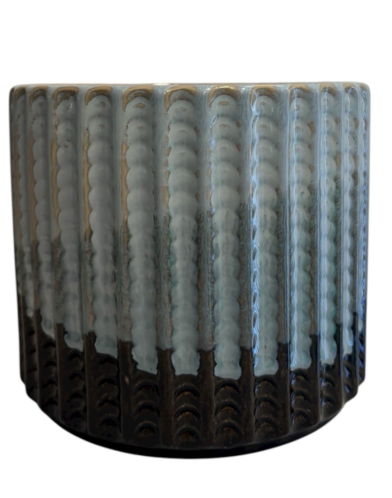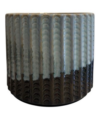 Ceramic Planter Pot Celestial Blue Moon Jardiniere Ribbed Drip Glaze Pale blue brown glaze.