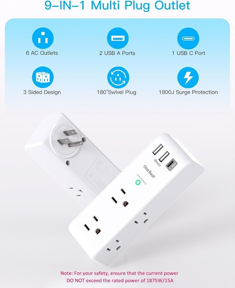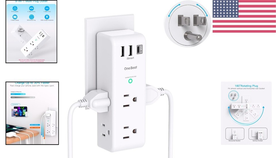 Certified 9-in-1 Surge Protector - 1800J Power Adapter with USB Charging ? ? ? ? ? ? ? ? ? ? ? ? ? ? ? ? ? ? Certified 9-in-1 Surge Protector - 1800J Power Adapter with USB Charging Features: 9 IN 1 USB Wall Outlet Extender: 6 AC outlets (3 sides, 15A/125V/1875W) with a built-in 1800 Joules surge protector and 3 USB charging ports (1 USB C, total output DC 5V/3.1A). Wide Space Rotating AC Plug: Unique 3-side space-saving design allows for big plugs without blocking each other; swivel power strip can turn 90 degrees for horizontal or vertical sockets. USB-C Smart Charging Ports: With built-in smart IC technology, USB ports deliver optimal charging speeds; USB A up to 2.4A/5V per port, USB C up to 3A/5V max. 1800J Outlet Surge Protector: Three complementary surge protection circuits (TVS, MOV, GDT) with a response speed of less than 1Ns, providing a minimum energy absorption capacity of 1800 Joules. Multi Safety Protection: Certified, preventing devices from over-current, over-charge, short circuits, and overheating with a fire-resistant ABS shell (up to 1382?). Benefits: Protects your valuable electronics from electrical spikes. Provides ample space for large plugs without compromising outlet access. Ensures optimal charging for all your devices with smart technology. Compact and portable design makes it easy to take with you wherever you go. Multi-layer safety features provide peace of mind while using your devices. Why choose our Certified 9-in-1 Surge Protector? When it comes to safeguarding your devices, nothing beats our Certified 9-in-1 Surge Protector. With its unique 3-side design, you won't have to worry about blocked plugs, and the rotating AC plug provides adaptability to any space. Each USB port is equipped with smart charging technology to maximize efficiency, while the surge protection circuits ensure that your cherished electronics remain shielded from power surges. This is not just a power outlet; it?s your trusted safeguard against electrical hazards. Transform your space today with this reliable, compact, and versatile power solution! Shipping Free Fast Shipping - We offer free shipping to most of the USA with a normal delivery time of 3-7 days. However, due to the current situation, additional delivery time (up to 3 weeks) may be required for some items. Alternative Carriers - We may use alternative carriers (e.g. USPS, FedEx, UPS, etc.) to ensure your package arrives safely and on time. Due to the use of multiple carriers, we are unable to provide a tracking number automatically. Handling Time - Orders are processed and shipped within 1-2 business days of receiving cleared payment. Shipping Restrictions - Shipping to Alaska, Hawaii, Puerto Rico, Guam, and other US territories may incur shipping charges or delivery restrictions. Please contact us before ordering, or your order can be refunded/cancelled. State Restrictions - There may be restrictions based on your state of purchase. For example, certain items may not be shipped to California due to state regulations. Contact for Tracking Updates - If you require tracking updates or have any concerns about the delivery of your order, please feel free to contact us, and we will be happy to assist you. Return 30-Day Hassle-Free Returns - We want you to be completely satisfied with your purchase. If you are not, you can return the item within 30 days of receiving it for a full refund or exchange. Easy Return Process - To start a return, simply contact us and we will provide you with a prepaid return shipping label and detailed instructions. Restocking Fee - There are no restocking fees for returns. However, the buyer is responsible for return shipping costs if the return is not due to a seller's error. Refund Processing Time - Refunds will be processed within 5 business days of receiving the returned item in its condition. Payment We accept all major credit cards, PayPal, and Apple Pay for your convenience. Your payment information is secure and encrypted to ensure a safe and seamless transaction. Please complete your payment within 3 days of purchase to avoid any delays in shipping. Feedback Your feedback is extremely important to us. We strive to provide the best products and customer service possible. If you are satisfied with your purchase, please take a moment to leave us a positive review. If you have any concerns or issues with your order, please contact us before leaving negative feedback. We are committed to resolving any problems and ensuring your satisfaction. Contact Us If you have any questions or concerns, please feel free to out to our customer support team. You can contact us through the messaging system. We are available Monday to Friday, 9:00 am to 5:00 pm EST, and we will do our best to respond to your inquiry within 24 hours. Buy it now and enjoy a pleasant shopping experience! Unit Quantity: 7 ounces Features: Rotating Plug,USB Charger,Surge Protection,USB Slot,Swivel Design,Wide Space Design,Smart Charging Technology Smart Home Compatibility: Not Applicable/Not Available Smart Home Protocol: Not Applicable/Not Available Type: Surge Protector Power Strip Number of Outlets: 6 Plug Type: Type B Input Voltage: 125 V Maximum Input Current: 15A Maximum Compatible Appliance Wattage: 1875 W Surge Energy Capacity: 1800 J Unit Type: oz Color: White Recommended Environment: Indoor Material: ABS Plastic Resistance Properties: Fire Resistant
