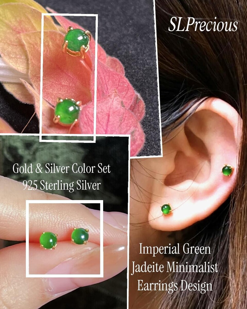? Certified Imperial Green Jadeite Minimalist EarringsBurmese Origin A-Grade Natural Untreated S925 Sterling SilverGold Silver Color Set ? Timeless Luxury ? Everyday EleganceCelebrate purity and prestige with these certified Burmese jadeite earrings?featuring vivid Imperial Green cabochons in a sleek minimalist stud design. Available in both gold and silver finishes, these earrings offer refined versatility for collectors and style-conscious wearers alike. ? Value Rarity? ? Imperial Green Jadeite: Renowned for its intense saturation and high translucency? ? Type A Certification: 100% natural, untreated?no dyes or resins? ? Burmese Origin: Increasingly rare and highly prized by collectors? ? Certificate No.: Z2412003595 (QR-verifiable) ? Symbolism Benefits? ? Peace Prosperity: Jadeite is believed to attract abundance and emotional balance? ? Protection Clarity: Traditionally worn to shield against negativity and enhance wisdom? ? Cultural Legacy: Revered as the ?Stone of Heaven? in Chinese and Southeast Asian traditions ? Design Craftsmanship? Stone Size: 3.8 4.8mm (with setting)? Material: Solid S925 Sterling Silver? Finish Options: Gold Silver color sets? Style: Lightweight minimalist stud earrings? Crafted By: Skilled artisans with secure prong settings and flawless polish? Hypoallergenic Tarnish-Resistant ? Packaging Includes?? Authenticity Certificate + QR Code?? Elegant Jewelry Box?? Jadeite Treatment Oil?? Jewelry Pouch?? Cleaning Cloth?? Zip-lock Storage Bag?? Free Worldwide Shipping with Tracking ? Care Instructions? Avoid perfumes, hairsprays, and harsh cleaning agents? Store in the provided pouch or box to prevent scratches? Clean gently with a soft cloth; avoid abrasives? Remove during swimming or strenuous activity