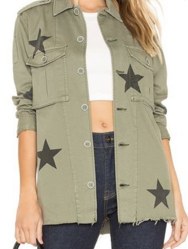 The is a boyfriend fit military style jacket. This style in the Royal Honor color features an all over black star print. True to fit