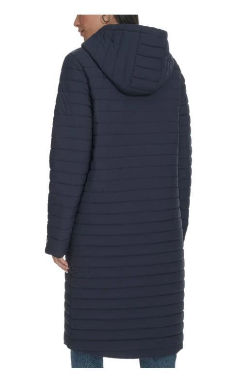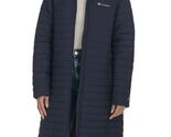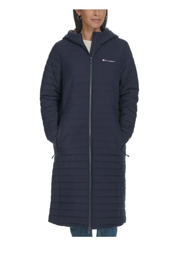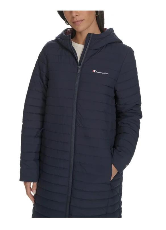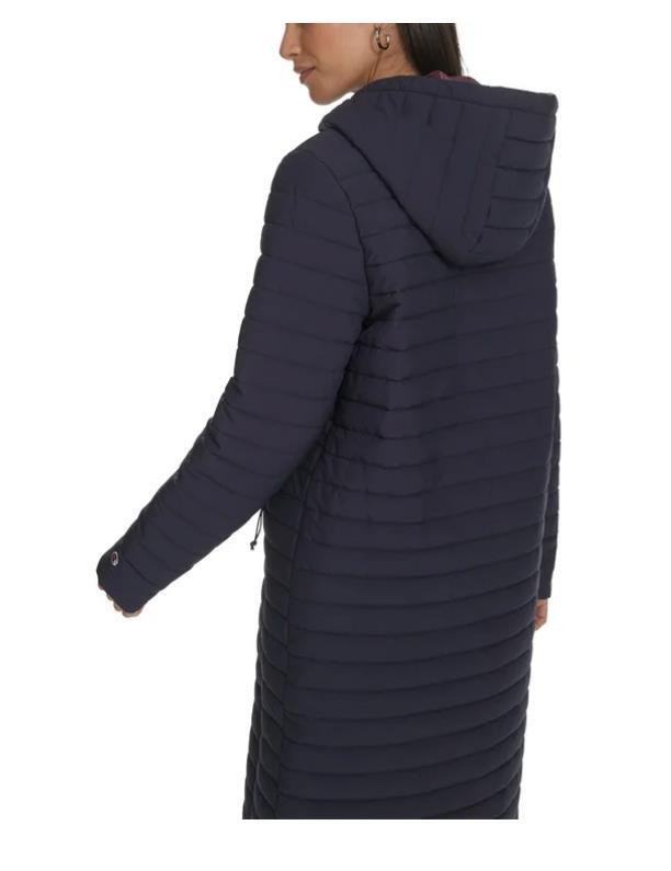 - Champion Womens Coat Blue Puffer Long Hood Pockets Stretch Sideline Logo