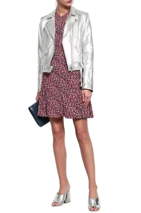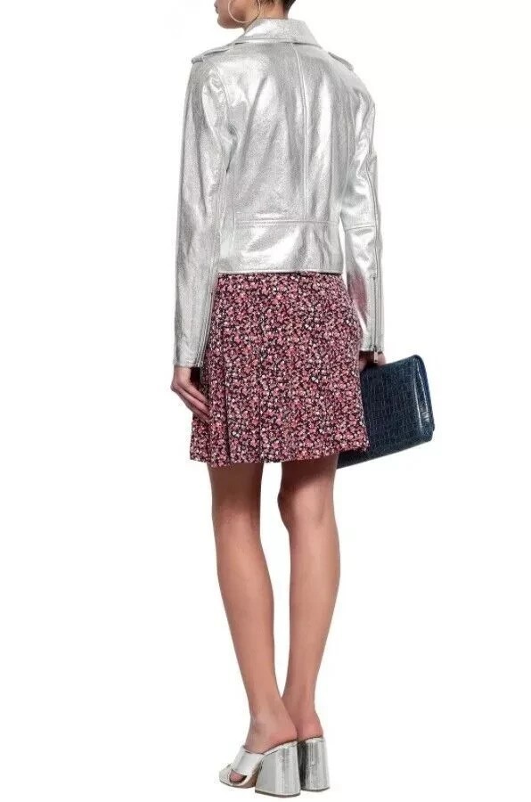 Chaqueta plateada elegante de cuero para mujer Hecha a mano Piel de cordero Casual Motociclista Ajuste suave\MN