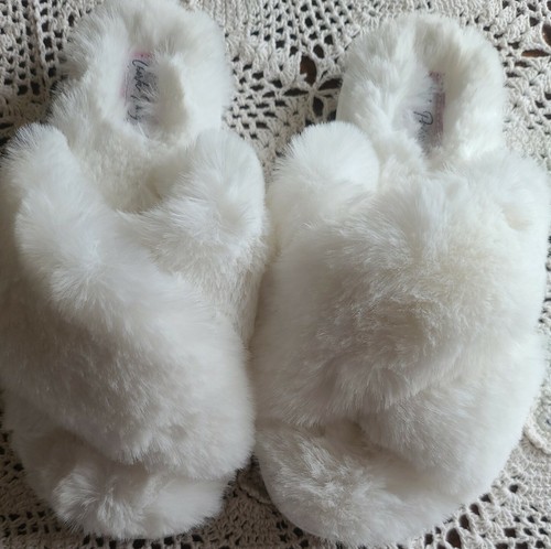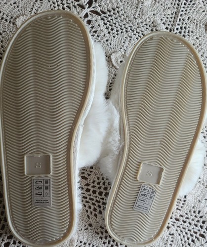 This sale is for one (1) pair of Charlie Paige brand slippers Women's Size Small (5-6) (sole measures approximately 9.75" long ~ heel to toe x 3.75" wide at widest area) White in color Slip-on slippers Open toe Crossover slipper Faux fur ~ Polyester Slippers are new ~ never worn Please view photos for a good description of these slippers Thank you!