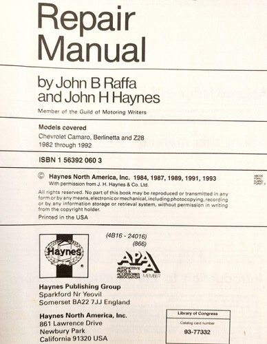 - Chevrolet Camaro 1982-1992 All Models Haynes Repair Manual Vintage PB BKBX10