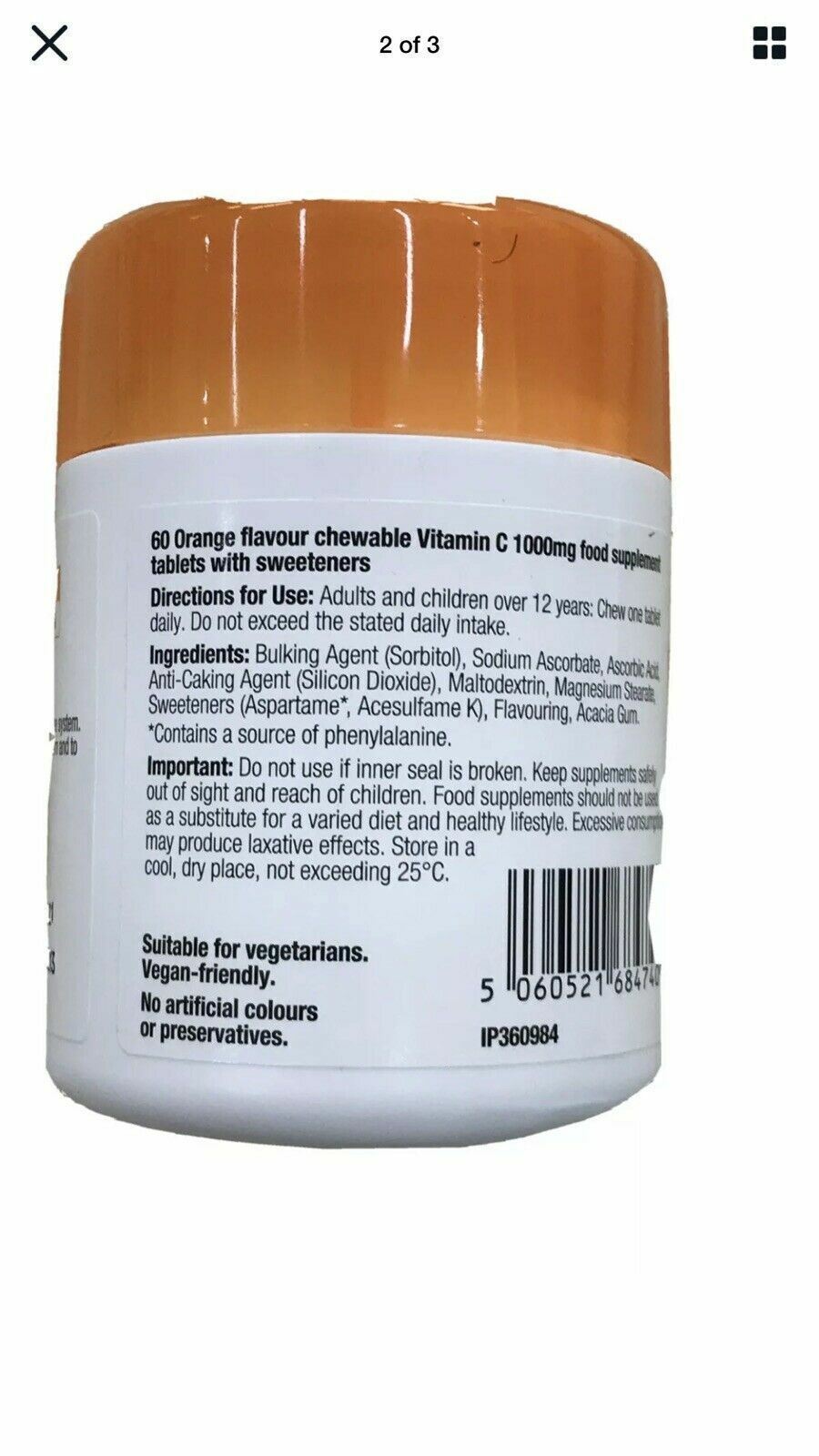 Chewable Vitamin C 1000mg For immunity Orange Flavour Vegan Friendly Chewable Vitamin C 1000mg For immunity Orange Flavour Vegan Friendly. Condition is New. Dispatched with Royal Mail 1st Class. We accept payment by any of the following methods: PayPal Please pay as soon as possible after winning an sale, as that will allow us to post your item to you sooner! Payment Shipping We offer FREE shipping on all orders! Your order will be dispatched within 1 working day of receiving payment (Monday-Friday) and you should expect to receive it one or two days after dispatch (for orders sent RM 2nd Class). In the very unlikely event that your item is lost or damaged during post, then WE will issue either a full refund or replacement. Returns If you are not 100% satisfied with your purchase, you can return the product and get a full refund or exchange the product for another one, be it similar or not. You can return a product for up to 14 days from the date you purchased it. Any product you return must be in the same condition you received it and in the original packaging. Please keep the receipt. Disclaimer Our site aims to provide the best possible information on health, herbal medicines and medicinal plants. This information should not replace professional advice by a qualified medical or herbal practitioner. Many minor health conditions such as colds and flu are suitable for self-treatment. However, if you are worried about any health condition, it is always advisable to have a face-to-face consultation with a doctor or other healthcare practitioner in order to obtain a diagnosis and treatment advice. Information contained within this site is original and written with the greatest possible care. This however, does not exclude the possibility that, because of developments in the field of herbal healthcare, errors may appear. Natural care 53 is a herbal shop based in Manchester, England. We have a wide range of Herbal, Unani and Ayurvedic products in our shop. we pride ourselves our excellent customer services and amazing product value. We offer our buyers free delivery service where possible and cut the costs so the benefits can be passed on. Customer satisfaction is our upmost priority. We aim to please! And with this in mind we request our customers to contact us if there is an issue with our services or products. If we can't resolve it we will refund you. So please contact us before leaving feedback. We are committed to building lasting relationships with everybody we deal with. encourage direct communication, and much prefer you contact us directly before opening a case or leaving negative feedback Listing and template services provided by inkFrog