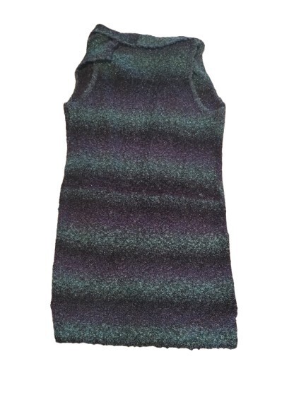 Chico?s long shimmering knit sweater vest in size Medium. Open front design with blended dark tones and subtle sparkle. Features: ? Metallic thread shimmer ? Warm, soft, cozy ? Open front, long length Material: 70% Acrylic / 28% Polyester / 2% Metallic Measurements: ? Shoulder to shoulder: 18" ? Shoulder to hem: 46" Condition: Excellent pre-owned. No holes or stains.