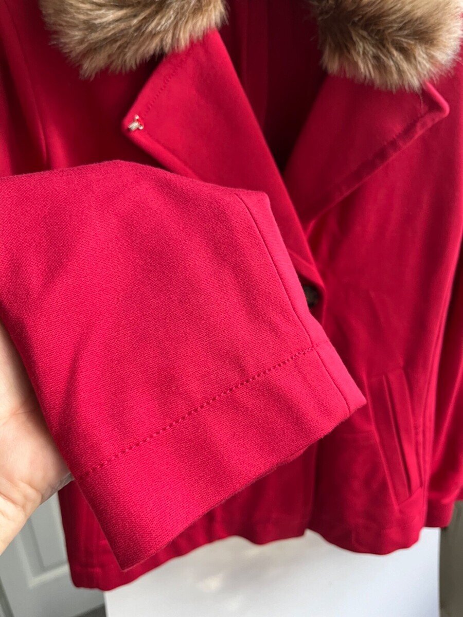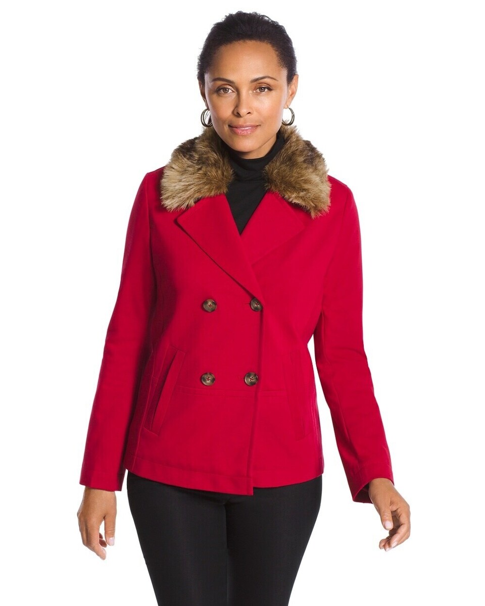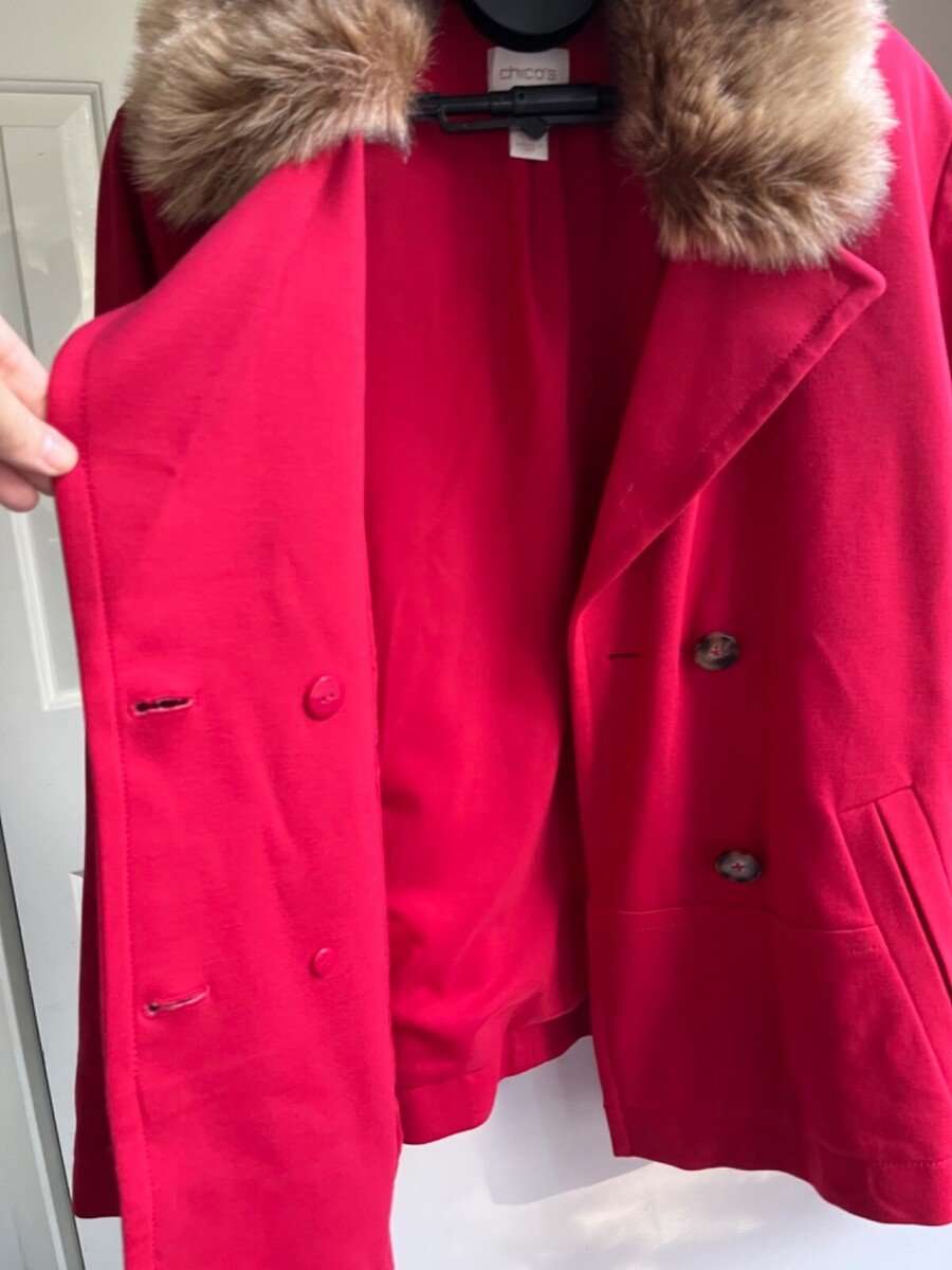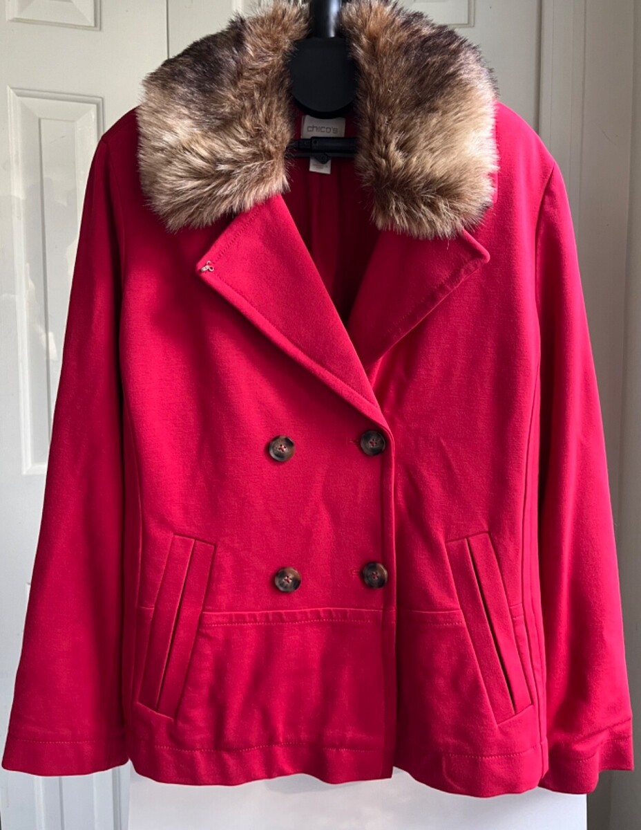 - Chicos Faux Fur Red Pea Coat Jacket Cross Button Lined Long Sleeve, Size L