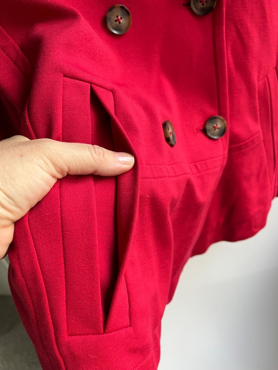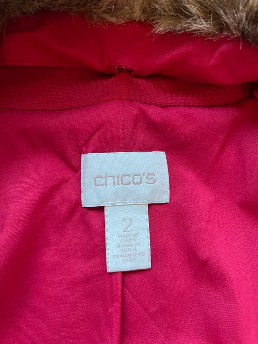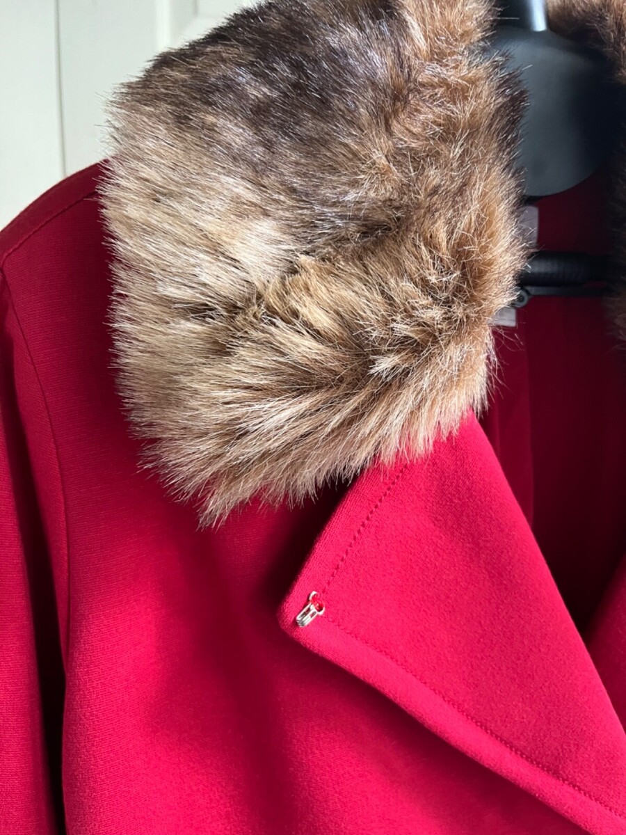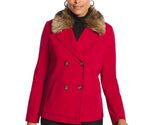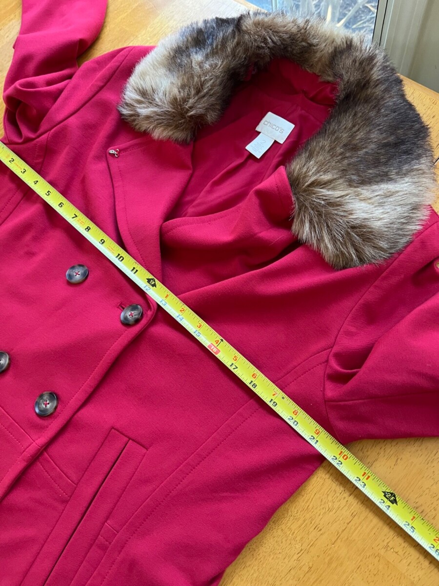 - Chicos Faux Fur Red Pea Coat Jacket Cross Button Lined Long Sleeve, Size L