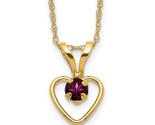 This children's birthstone necklace is crafted from polished 14K Yellow Gold and features a genuine 3mm round cut rhodolite garnet stone in the center of a polished round heart pendant.