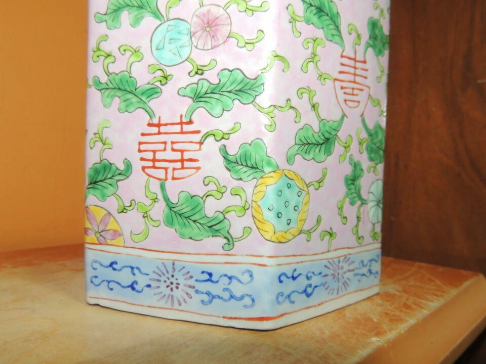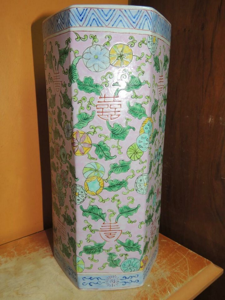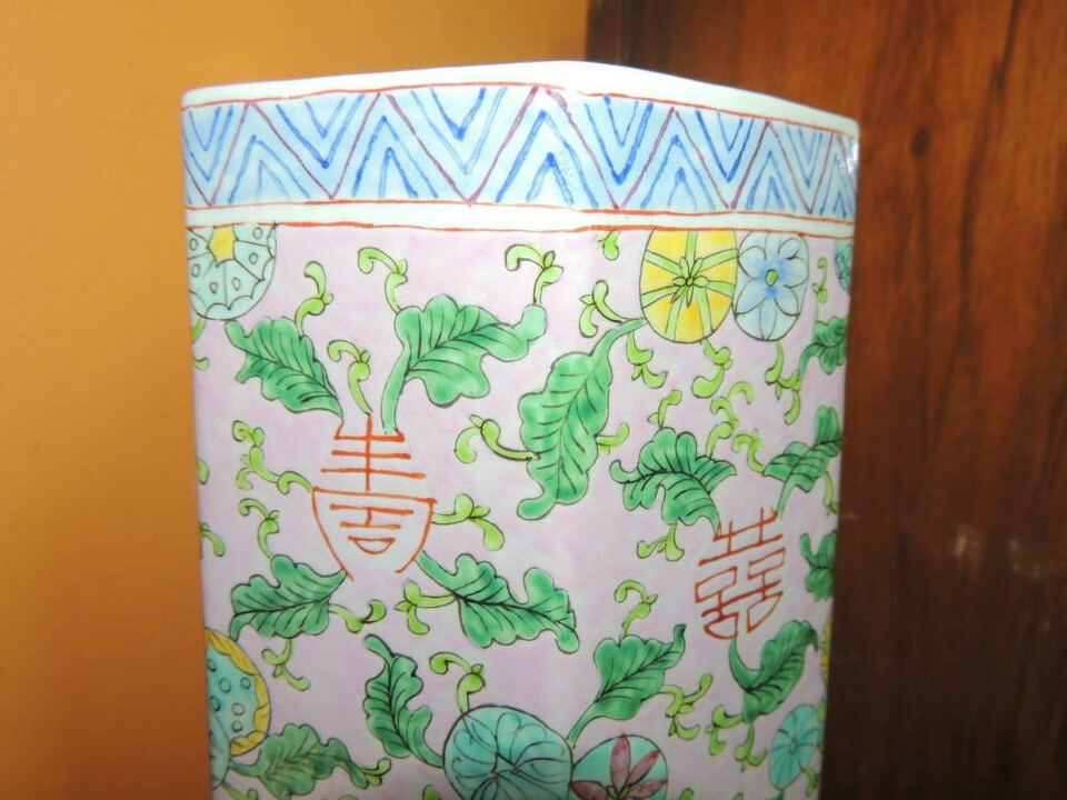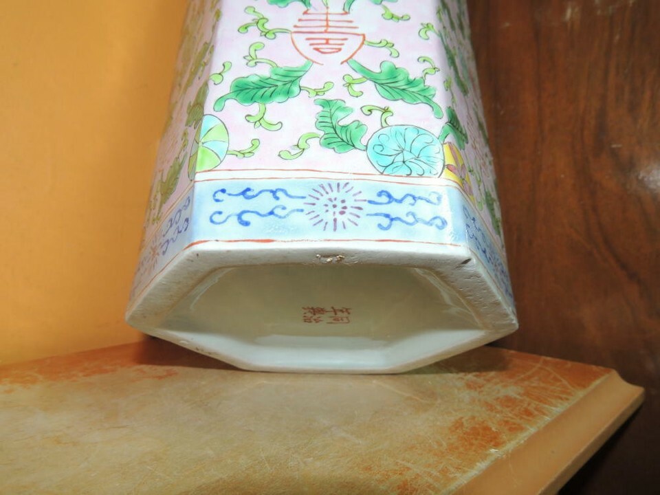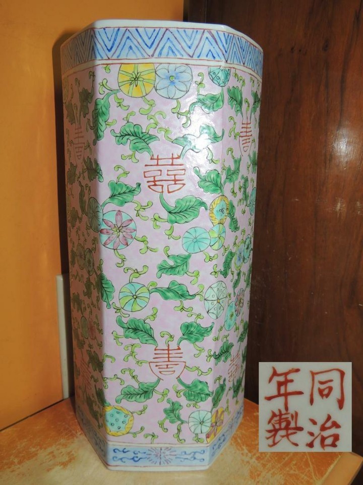- Chinese 11" Vase Famille Rose pink floral six sided hexagon Qing Tongzhi mark