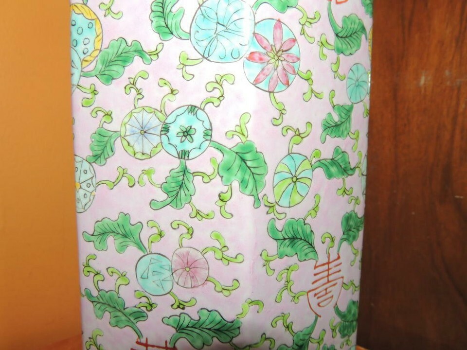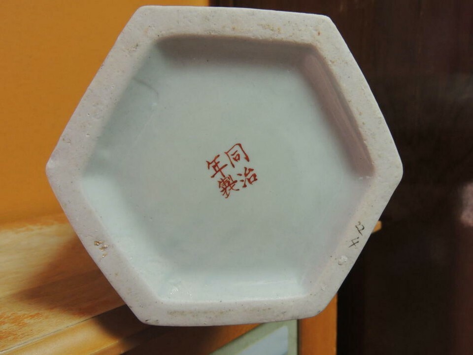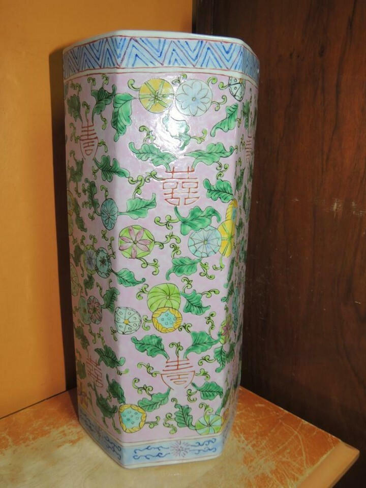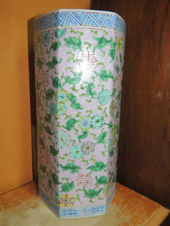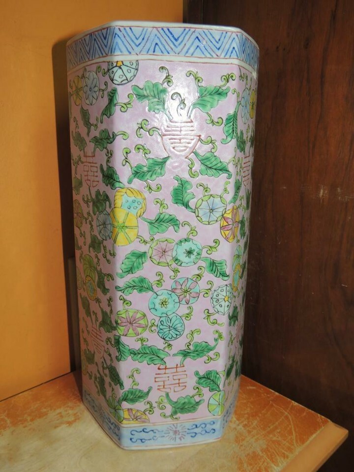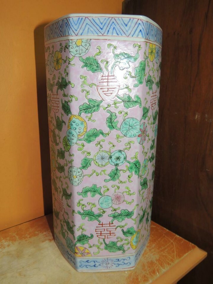 - Chinese 11" Vase Famille Rose pink floral six sided hexagon Qing Tongzhi mark