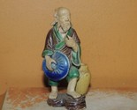 - Chinese Mud Man 3.5"brown robe green yellow basket hat Mudman Men Antique c1935