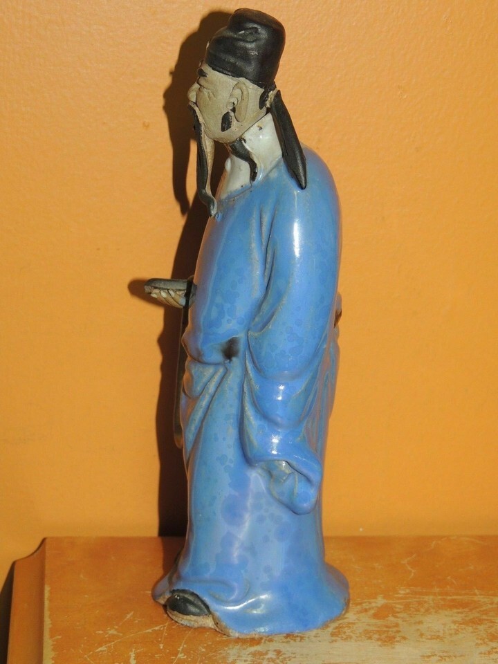 - Chinese Mud Man Men 7.25" Blue& White overglaze scroll Mudman Antique drip glaze