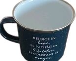 This Sale is for One (1) Coffee Mug REJOICE IN hope; BE PATIENT IN tribulation, BE CONSTANT IN prayer. ~ Romans 12:12 Slightly speckled background with a Bible verse printed one one (1) side Measures approximately 3 3/8" diameter x 3 1/4" tall Mug holds 12 ounces Durable ~ enamel coating on metal Easy to grasp and comfortable to hold ~ lightweight Resilient for everyday use Reusable Hot /or cold beverages Mug is new in box ~ never used Please view photos for a good description of this item Thank you!