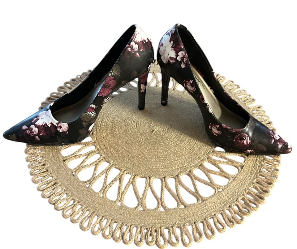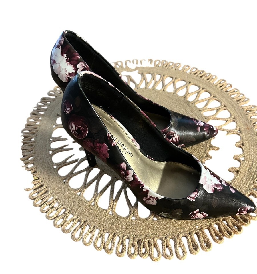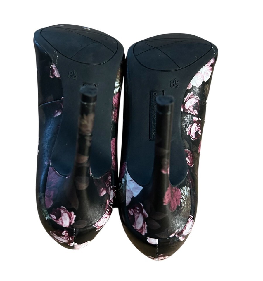Step out in style with these chic Christian Siriano floral pointed-toe heels. Featuring a beautiful dark floral print with deep purples and whites, these pumps are perfect for adding a feminine touch to any outfit. Very good pre-owned condition with minimal signs of wear.