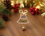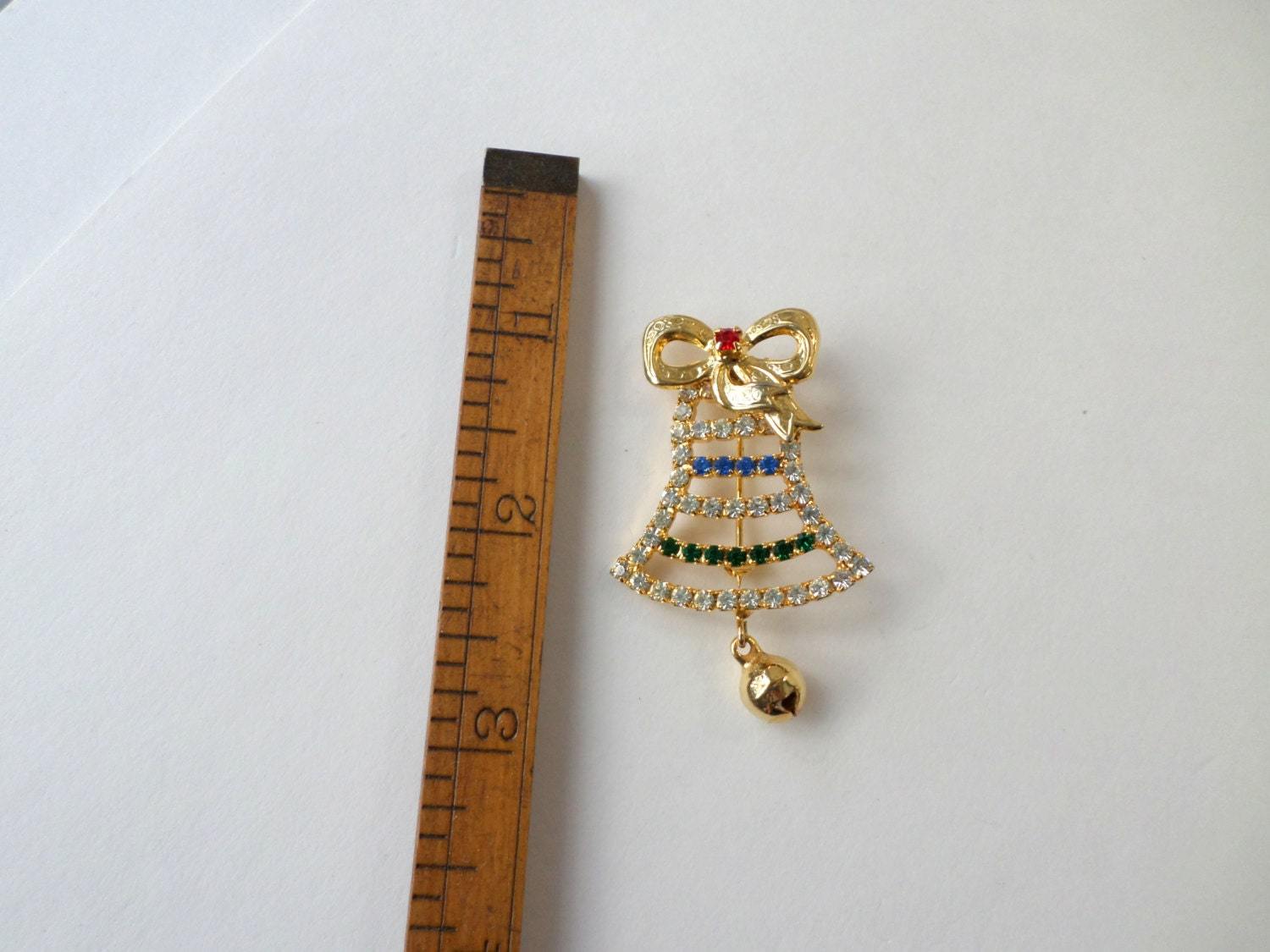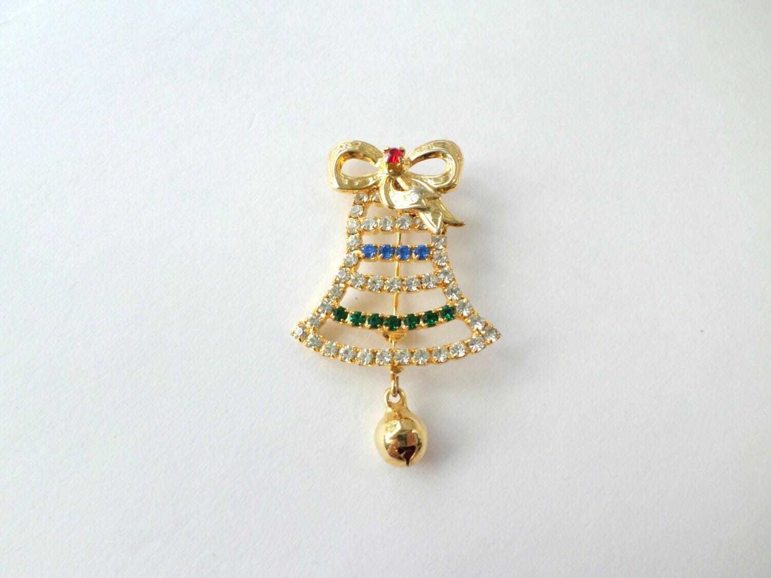 - Christmas Bell Brooch, Rhinestone Holiday Pin