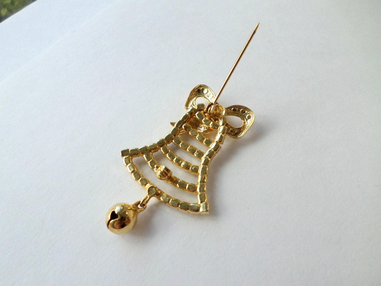 Christmas Bell Brooch, Rhinestone Holiday Pin