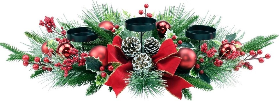 Our holiday candle holder is adorned with a festive blend of red bowknots, baubles, pine cones, red berries, green leaves, holly, spruce branches and pine needles.
