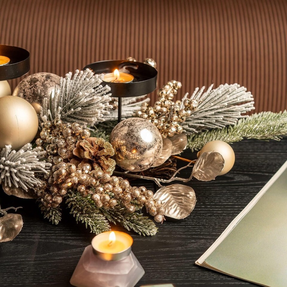 Our holiday candle holder is adorned with a festive blend of gold baubles, golden berries leaves, snowy flocked pine needles.