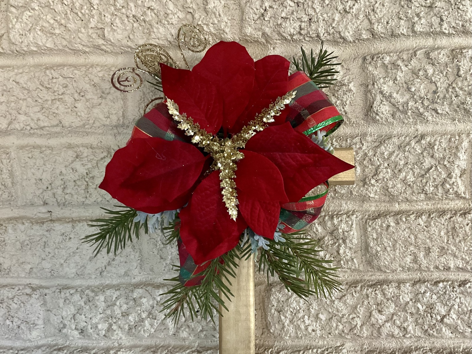 Honor your loved one this holiday season with a timeless tribute that shines with warmth and grace. This 18-inch handcrafted pine cemetery cross is lovingly painted gold, creating a radiant backdrop for its festive floral design.