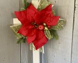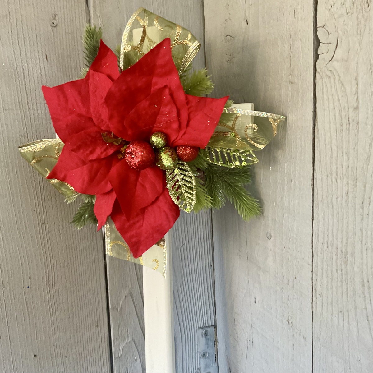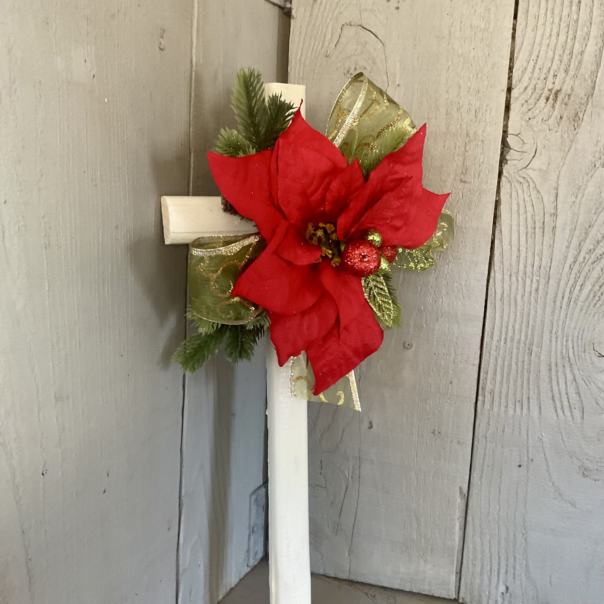 This 18” pine cemetery cross has been painted antique white with a large red poinsettia, green and red glitter picks, layers of fir branches, and green/gold sheer glitter ribbon. The cross has a pointed end for easy ground insertion. Every cross is sprayed with a coat of clear polyurethane to protect the ribbon and silk flowers from outdoor elements.