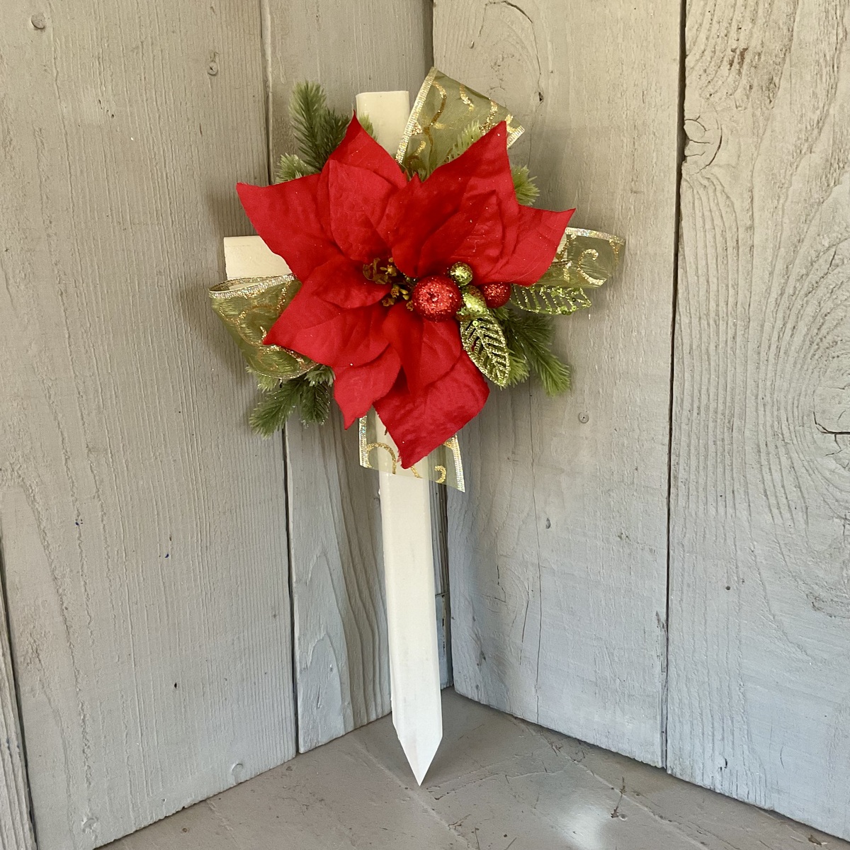 Christmas Cemetery Cross: Poinsettia grave flowers, Winter Grave Decoration