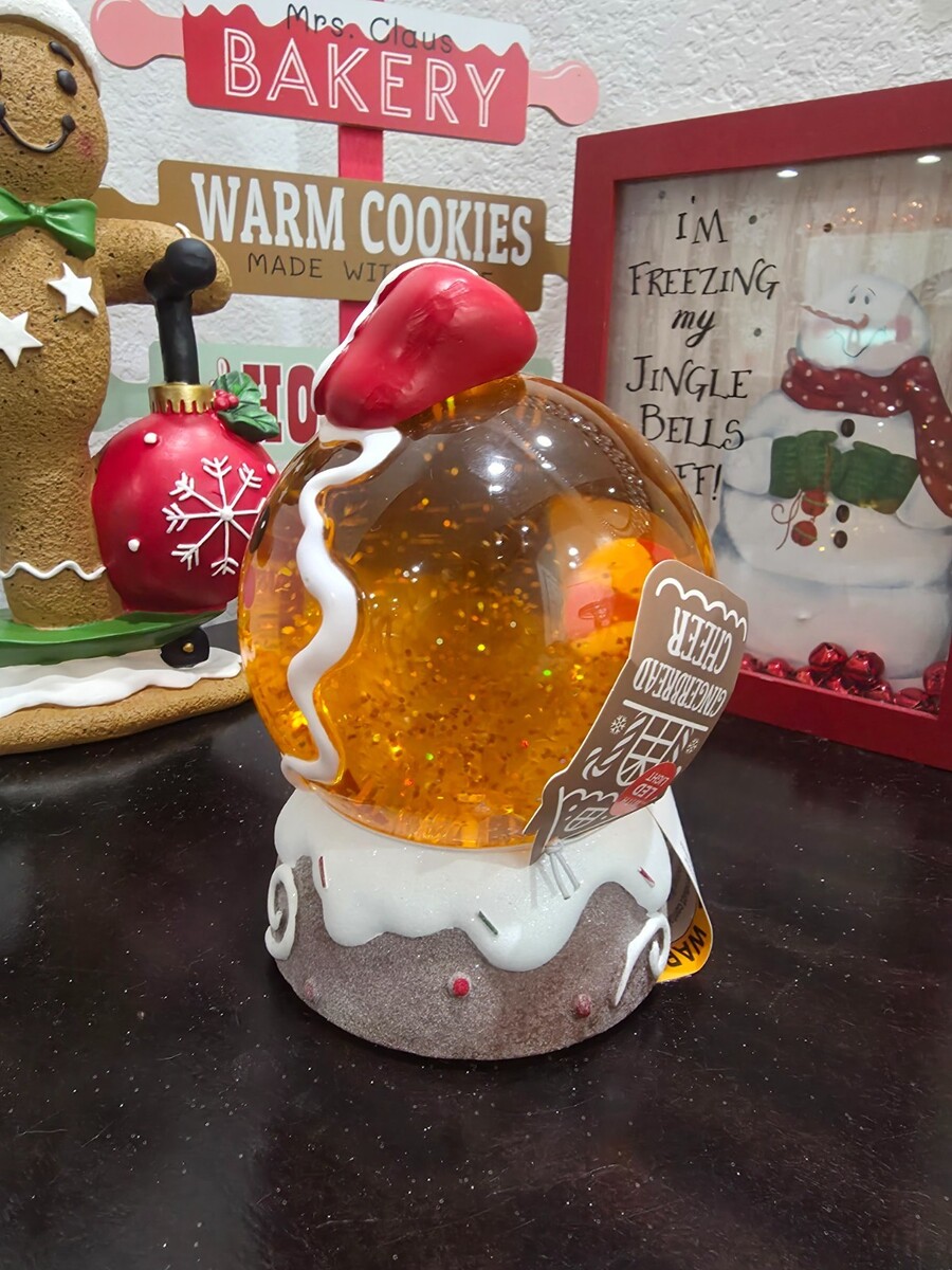 Up for sale we have this adorable gingerbread snowglobe for your holiday decor. The globe is sooo cute and it's a gingerbread girl face wearing a red bow. It stands approx 7" tall. New.