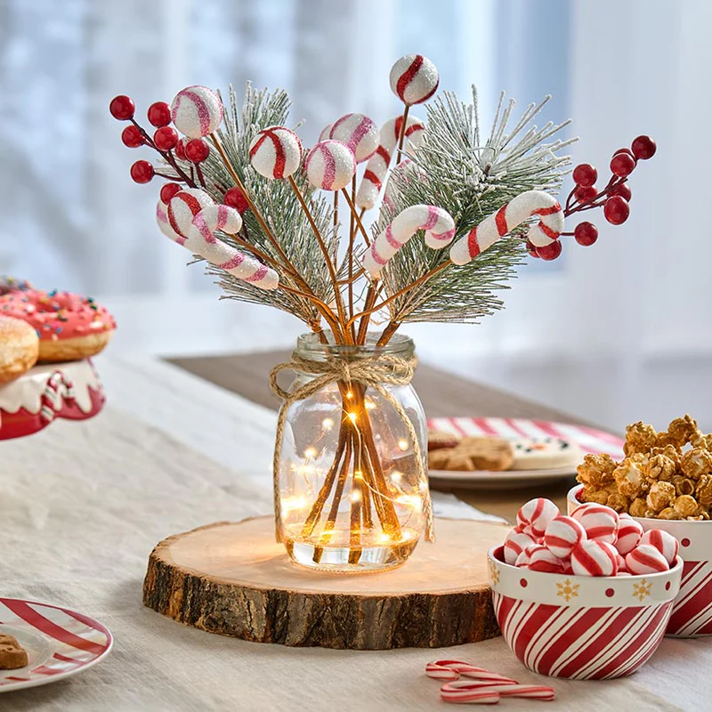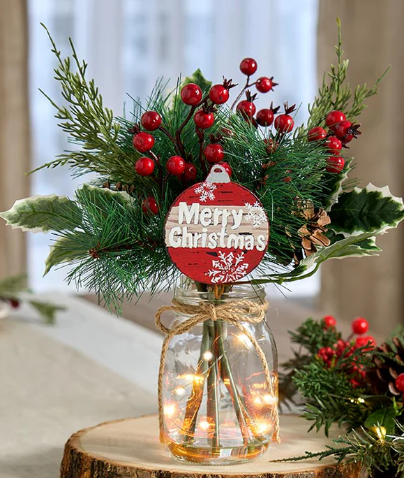 Christmas Lighted Bouquet Vase Arrangement Centerpiece Candy Cane or Evergreen