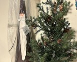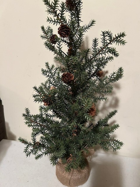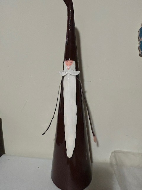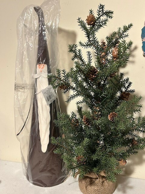 Here is a new24 inch tall artificial pine tree with attached small pinecones and a tall metal santa figure,, The tree is in a burlap sack base , it will need shaped to your liking when you receive it, it measures 24 inch tall and about 10 inch wide when shaped, The old world santa figure is made of metal and is a cone shape and brownish metal and has attached metal arms and inside is hollow, neat santa and measures 22 inch tall by 6 inch wide, unique holiday santa, so this tree and santa would look great for the holiday and winter season sitting on a floor area or mantle bottom or a large table top, etc unique winter decor, and check out my other holiday decor i i have listed and more coming daily and my all year round decor and lighting