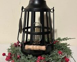Here is a new open design caged lantern with Holiday pine wreath , The lantern has a distressed finish and is made of metal and is open caged design and has attached led light bulb in it that can not be removed, this requires 3 AAA Batteries that are not included, has on and off switch on bottom where batteries go in, This lantern does NOT Have a timer on it, It measures 11.25 inch high by 5.75 inch wide, nice rustic led lantern, and has attached handle also, and i am including a new spruce pine with red berry artificial wreath that has shimmer on it, nice holiday wreath and the lantern fits inside the wreath nicely as you see, nice rustic lantern with wreath and check out my many other lanterns and decor and lighting i carry
