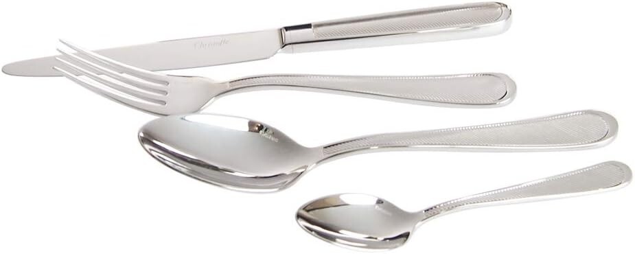 This stainless steel 24-piece set contains each of the following for 6 people: table forks, dinner knives, table spoons and coffee spoons.