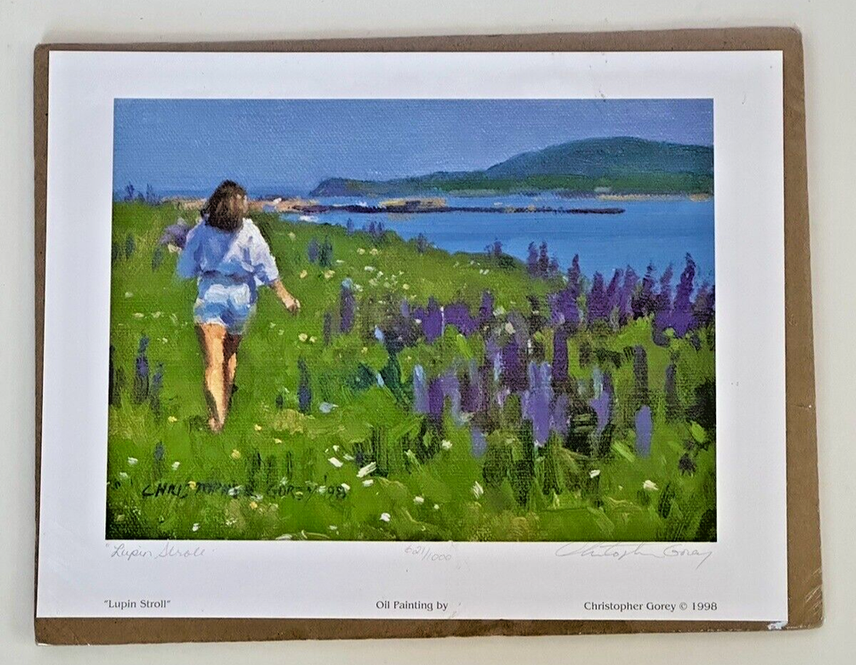 This is a beautiful limited edition print titled "Lupin Stroll" by renowned artist Christopher Gorey. The piece is signed and numbered by the artist and features a stunning landscape in shades of blue. Measuring 8.5 inches in length and 11 inches in width, this small, unframed print is perfect for any collector or enthusiast of Gorey's work.