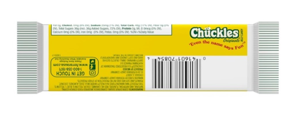 Enjoy these perfectly pocket shaped candies in cherry, lemon, licorice, orange, and lime Fat free and delicious, they'll be sure to make you question them! Each bar is individually packaged with all five flavors- get ready to be the fairest of them all! Join the generations of children that Chuckles Jelly candies have delighted with the irresistible, fruity taste Make everyone's life sweeter with Chuckles