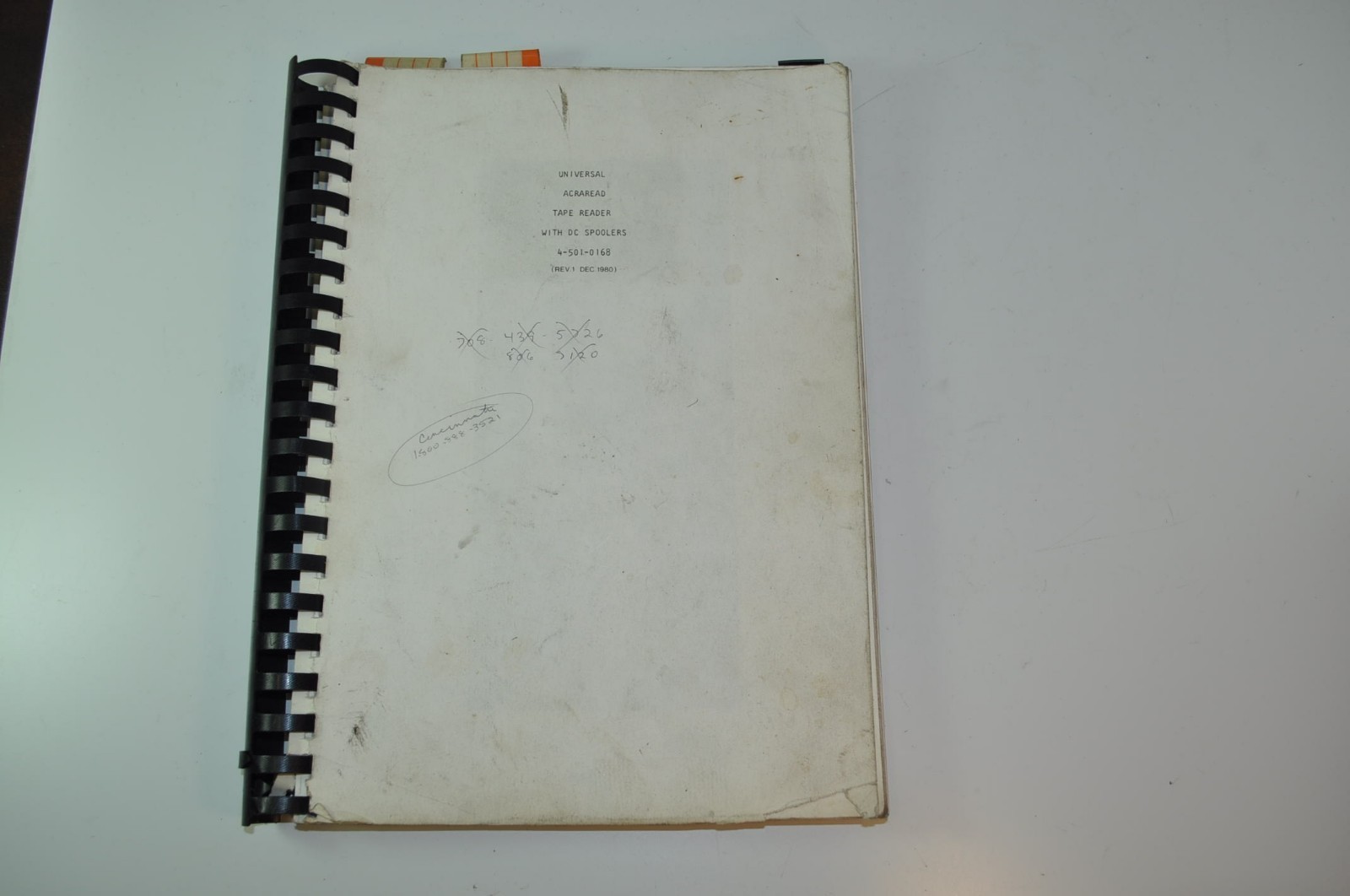 Cincinnati Milling Machine Universal Acraread Tape Reader Manual PN #- 4-501-0168 This is awesome. This is not to be found anywhere except right here. This is complete book. Covers - Tape Loading; Installation; Tape Reader info; Maintenance Procedures ; Tape Spooling Unit; Parts information, and more...... Will ship international. please ask questions. Please look at pictures.