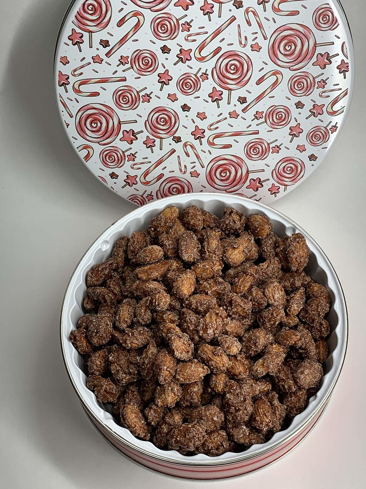 1.5 Pounds of deliciously sweet and crunchy cinnamon roasted nuts of your choice, in a seasonal gift tin. Patterns and weight may vary. Made in Texas.
