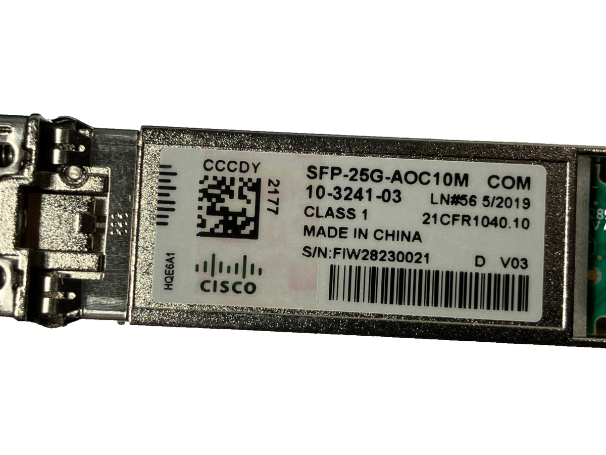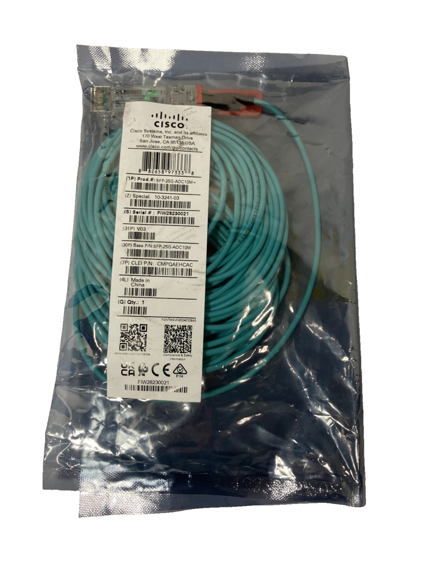 Genuine Cisco SFP-25G-AOC10M 10-3241-03 25G Base Active Optical Cable. Condition: Excellent Clean Condition! Genuine CISCO brand with hologram. See Photos. Packaging may be in plastic clam shell or in anti-static bag. USA SELLER !!! Ships from Austin, Texas !!! We are a Mom and Pop local business!!! All the money is spent back in the local and US economy!!! Thank you for the business!!! FAST SHIPPING!!! Overview The Cisco SFP-25G-AOC10M is a 10m active optical cable designed for high-speed networking applications. With a data transfer rate of 25 Gbps, this cable is ideal for connecting devices that require fast and reliable communication. The connectors on both ends are compatible with 25 Gigabit SFP28 interfaces, ensuring seamless integration into your existing network setup. Whether you need to extend the reach of your network or create new connections between devices, the Cisco SFP-25G-AOC10M provides a cost-effective solution without compromising performance. Upgrade your infrastructure with this dependable and efficient optical cable from Cisco's extensive range of networking solutions. Cisco SFP-25G-AOC10M 10m 25GB SFP+ BASE-AOC Active Optical Cable Specifications Cable Type : Active Optical Cable Product Description : 25GBASE-AOC Active Optical Cable 10-meter Cable Length : 10m (33 ft) Connector 1 : 25 Gigabit SFP28 Connector 2 : 25 Gigabit SFP28 Speed : 25 Gbps Model Number : SFP-25G-AOC10M Part Number : SFP-25G-AOC10M, SFP-25G-AOC10M=, SFP-25G-AOC10M-WS Platform support Cisco SFP-25G-AOC10M is supported on a wide range of Cisco equipment. Cisco N9K-C92348GC-X Cisco NCS-5501-SE Cisco N9K-C93180YC-FX Cisco C9500-48Y4C Cisco N540X-ACC-SYS Cisco N9K-X97160YC-EX Cisco N540-ACC-SYS Cisco N9K-C92160YC-X Cisco NCS-5501 Cisco N9K-C93180YC-EX Cisco C9500-24Y4C Cisco N9K-X96136YC-R
