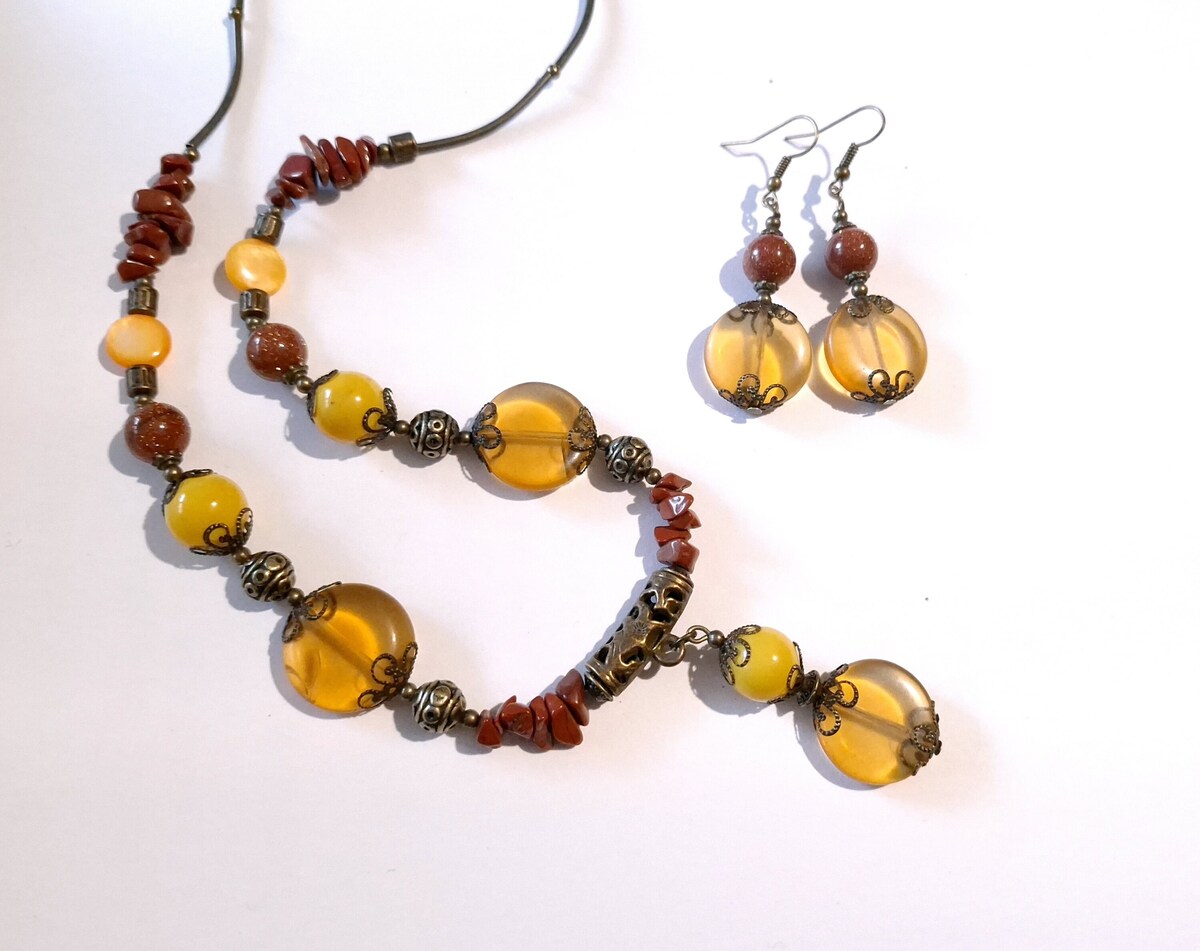 Beautiful bronze Victorian style jewelry set pendant necklace and earrings with yellow large round Citrine, brown Jasper, Sunstone, yellow Mother of pearl and yellow fine porcelain beads and gorgeous bronze ornaments . Boho necklace . Boho earrings. Boho jewelry set. Bohemian necklace . Bohemian earrings . Romantic style necklace and earrings jewelry set . Baroque style necklace and earrings . Beautiful necklace and earrings.