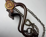 The side bosses and the ?cricket? or ?roller?, the ribbed cylinder in the mouthpiece port is made of brass and are intact. Take note of the side bosses, they each have a period after the letter ?U? Earlier models did not have any periods. The ?cricket? or ?roller? acted as a pacifier, providing the horse with a distraction to occupy itself, as well as stimulating the horse to salivate and keep the bit lubricated. Unmarked, unknown maker. The hole that you can see centered on the mouthpiece port supported the ring which would have been riveted to this mouthpiece. In this case the ring was removed. These rings had the effect of causing the horse to become frenzied under a rough hand and were inhumane to use. A steel chain with two open hooks is attached to the two rings. The two chains are then connected to a steel horseshoe. A 27? chain is connected to the top of the horseshoe.
